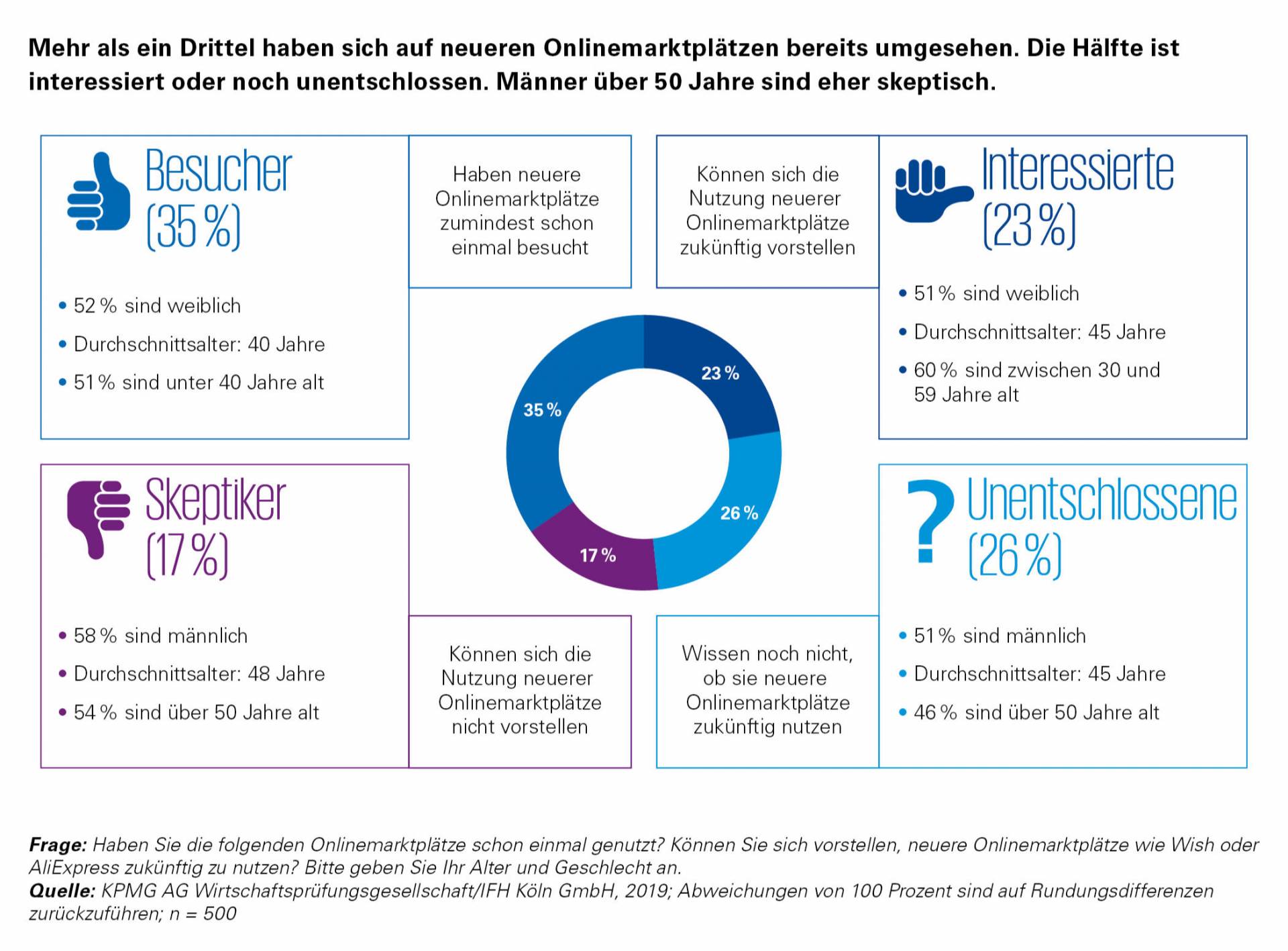 Allerdings haben immerhin 15 Prozent der Befragten schon einmal etwas bei Wish gekauft, etwa ebenso viele haben zumindest die Website oder App bereits besucht. Neben jenen, die neuere Marktplätze bereits einmal genutzt haben, können sich 23 Prozent der Konsumenten vorstellen, künftig bei neuen Anbieter einzukaufen. Weitere 26 Prozent sind noch unentschlossen, ob sie Wish und Co. in Zukunft nutzen werden. Das zeigen die Ergebnisse des Consumer Barometers von IFH Köln und KPMG, für das 500 Konsumenten befragt wurden.