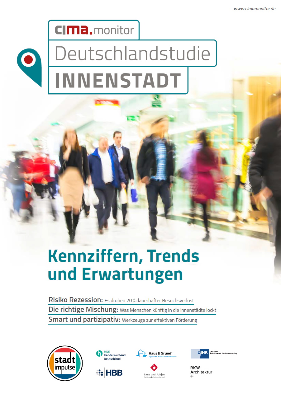 Herausfordernd bleibt die Frage, mit welchen Nutzungen und Angeboten die Lücke, die der Handel als Besuchsgrund hinterlässt, zu schließen ist. Hier sind Städte, Staat, Investierende und Unternehmen gleichermaßen gefordert. Martin Kremming, Studienleitung und Geschäftsführer der CIMA Beratung + Management GmbH, greift auf, was in Zeiten eines drohenden dauerhaften Besuchsverlusts diskutiert wird: „Ein neues Gleichgewicht muss her. Die Innenstadt als Lebensort rückt in den Fokus. In den City-Lagen braucht es mehr öffentliche Aufenthaltsräume mit entsprechenden Angeboten der täglichen Versorgung, Freizeit und Gesundheit.“