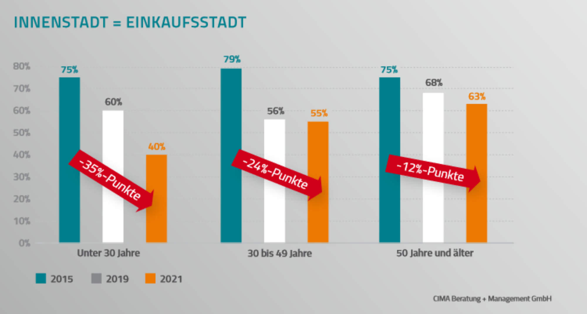 Noch im Jahr 2015 gaben mehr als drei Viertel der Befragten an, die Einkaufsmöglichkeiten der Innenstadt zu schätzen. In der aktuellen Befragung sind es nur noch rund 56%. Dass eine attraktive Innenstadt sich durch Einkaufsmöglichkeiten auszeichnet, geben insbesondere unter 30-Jährige immer seltener an – hier steht ein Minus von 35%, nur noch für 40% der befragten jüngeren Menschen spielt Shopping eine zentrale Rolle.