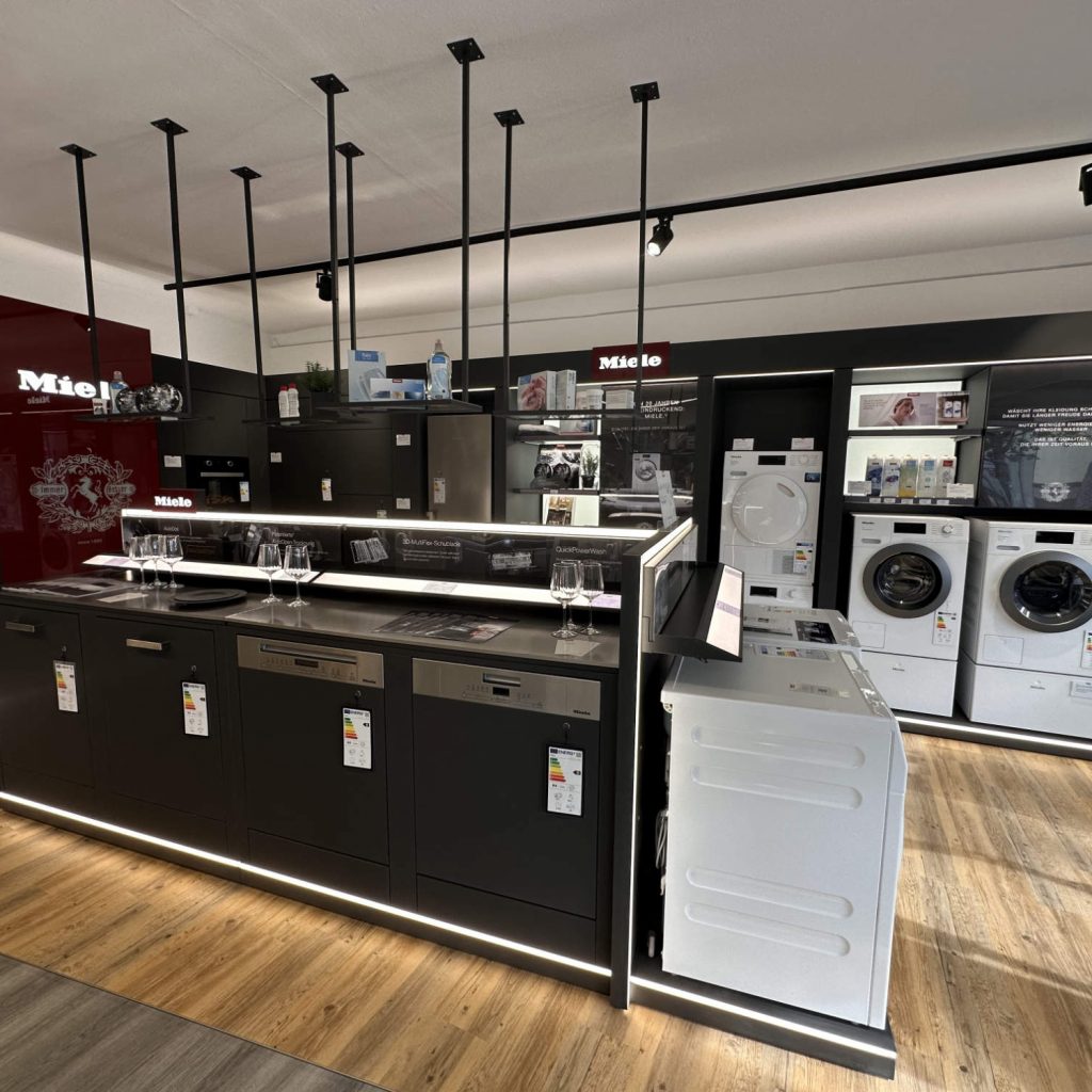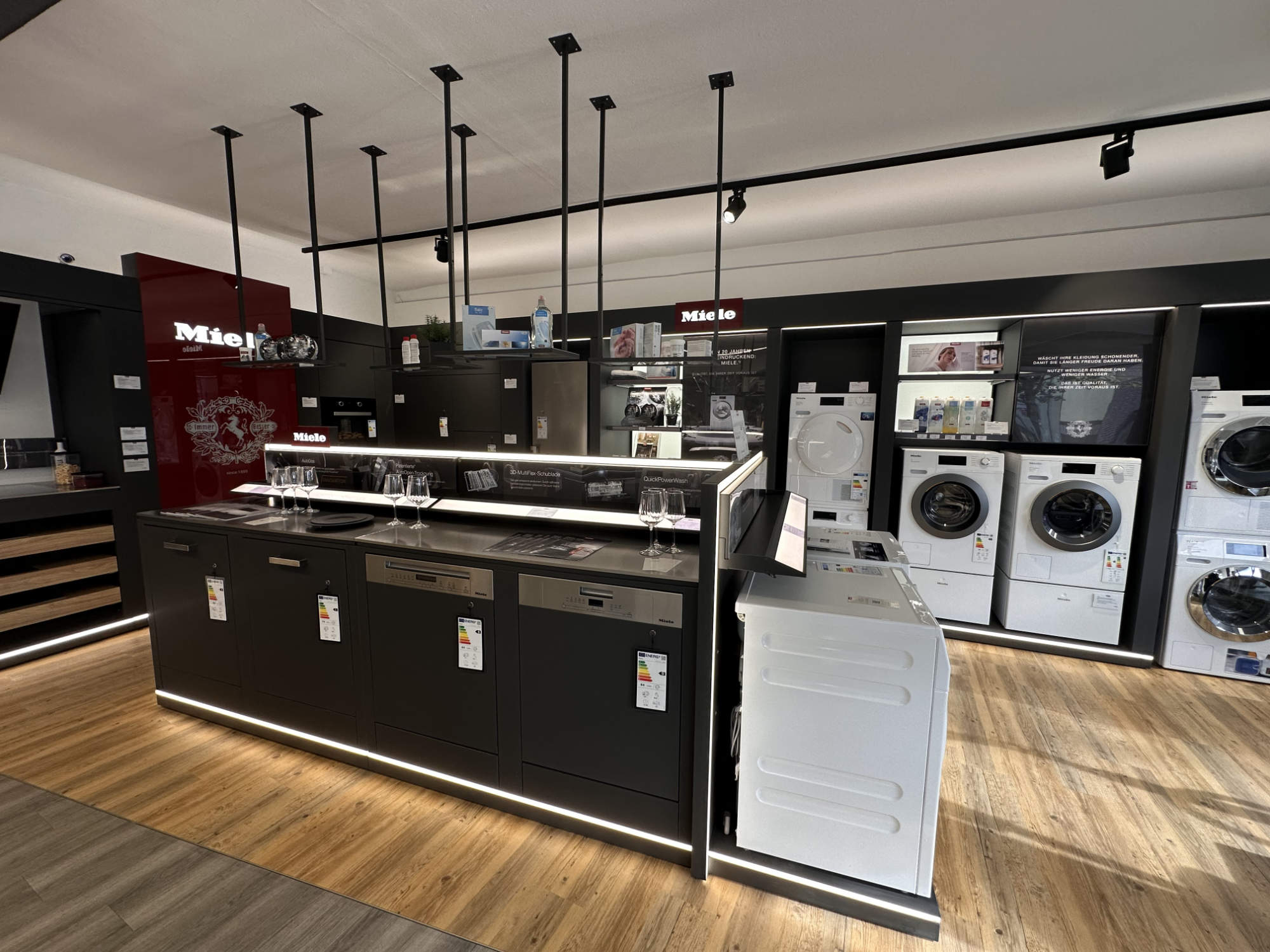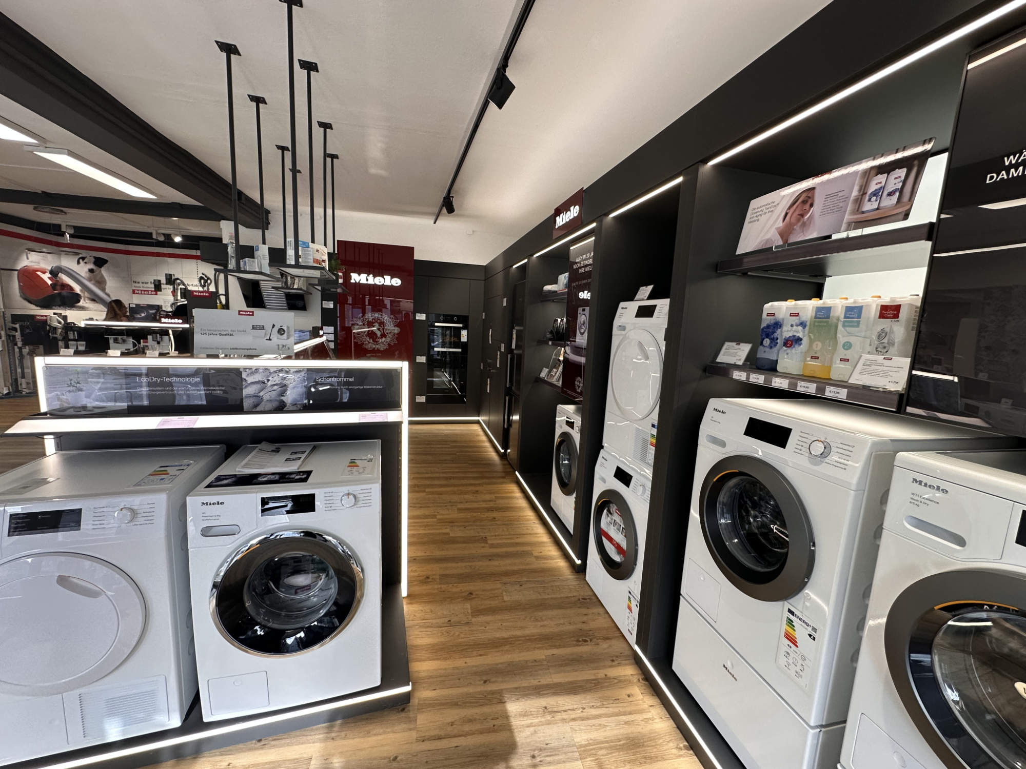 Themeninseln wie Backen & Kochen oder Waschen & Trocknen geben dem Kunden Orientierung und setzen die technischen Sortimente auf 230 Quadratmetern emotional in Szene. Mit dabei: die Top-Marken aus den Bereichen Großgeräte und Kleingeräte, unter anderem Siemens und Liebherr. Eine eigene Präsentationsfläche hat man bei Treu dem Premium-Hersteller Miele gewidmet.