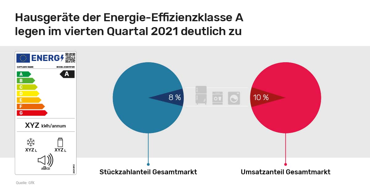 Dies zeigt sich sowohl bei der Stückzahl-, als auch beim Umsatz, welche sich im Laufe des Jahres 2021 mehr als verdoppelt haben. So waren zwischen Oktober und Dezember 2021 bereits knapp 8% der verkauften Waschmaschinen, Spülmaschinen, Kühl- und Gefriergeräte laut Energie-Effizienzlabel in der Klasse A eingestuft. Der damit erwirtschaftete Umsatzanteil lag in diesem Zeitraum bereits über 10%.