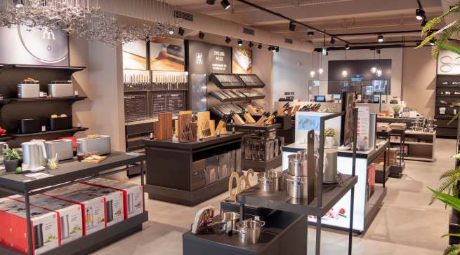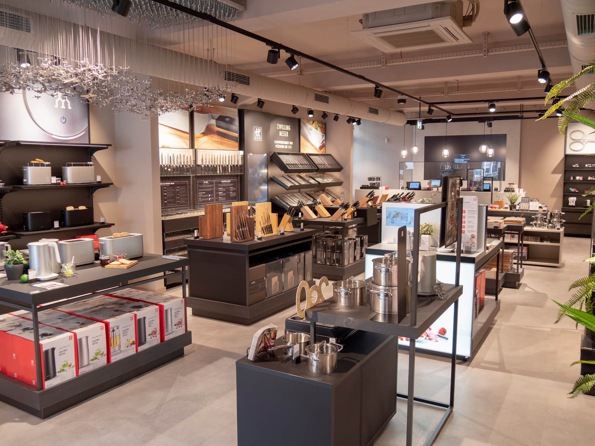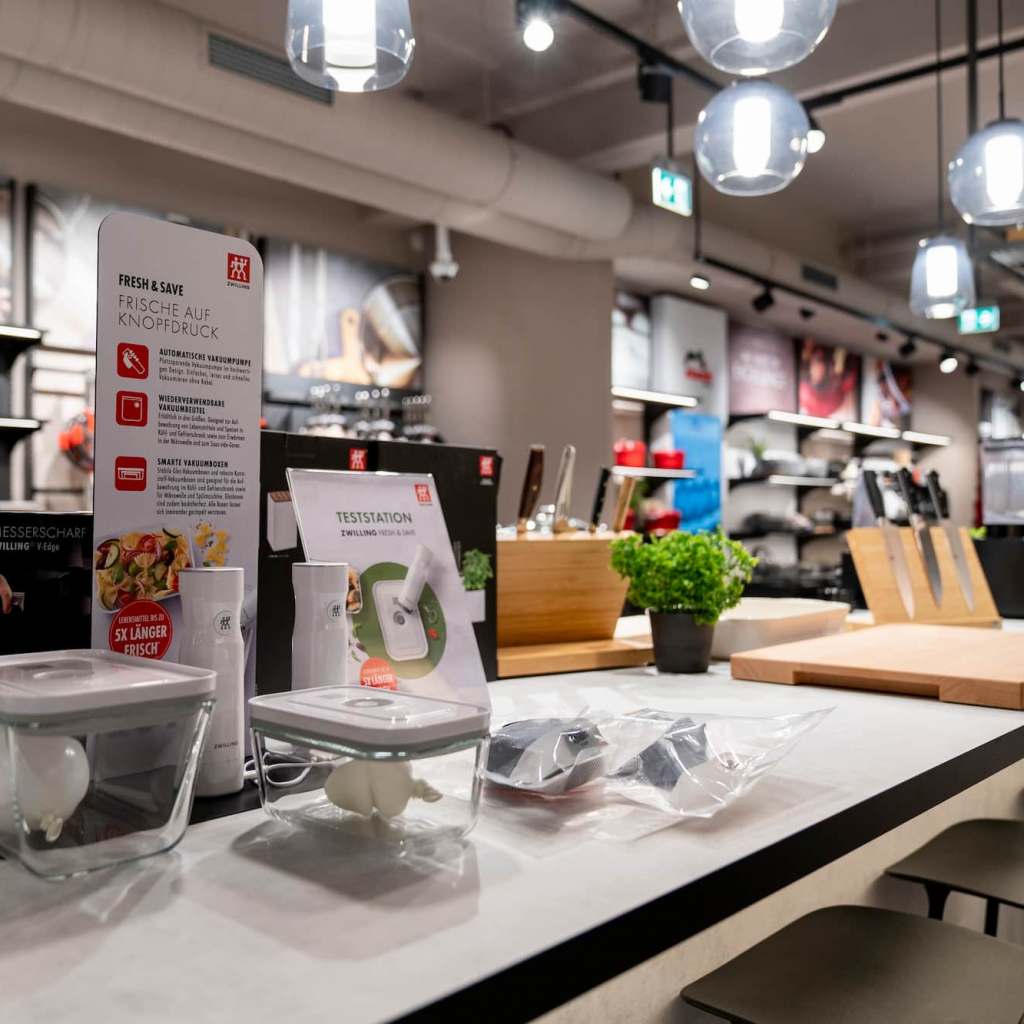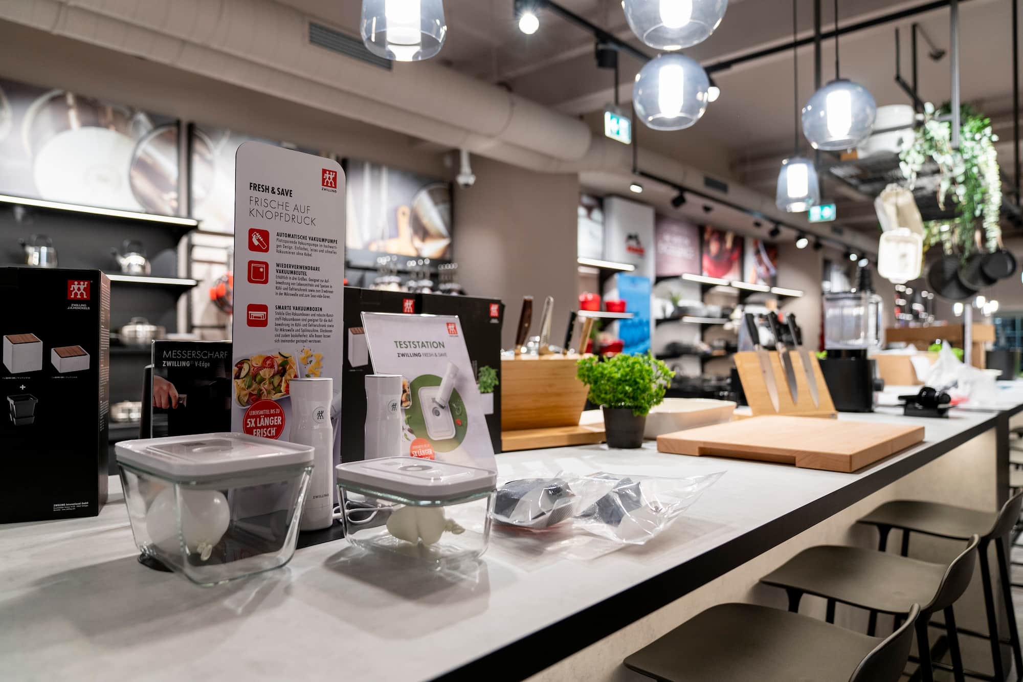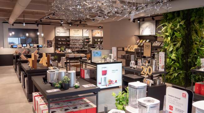 Um das Einkaufserlebnis komplett zu machen, wurden zudem die On- und Offline-Welten stärker verknüpft und dafür verschiedene digitale Elemente verbaut. Dazu gehören Screens in den Markenbereichen und eine neue „Digital Wall“, über die sich Kundinnen und Kunden per Touchscreen über die Produkte von Zwilling informieren können.