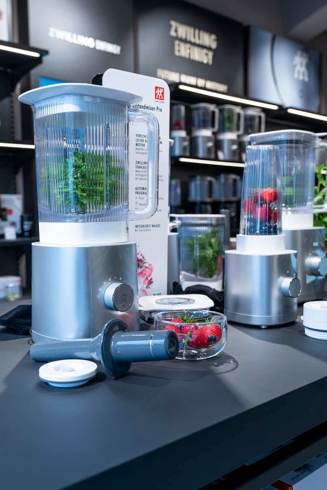 Wer den 380 Quadratmeter großen Shop direkt neben der Hauptzentrale des Unternehmens betritt, wird von einer warmen Atmosphäre im Industrial-Style empfangen. Mit Stahlrohren, Elementen in dunkler Holzoptik und einem Boden in Betonoptik holt Zwilling die geschichtsreiche Produktionstradition direkt in den Verkaufsraum. Eine gezielte Beleuchtung, großflächige Visuals, Sounds und Produktinszenierungen unterstreichen dieses Ambiente, in dessen Umfeld auch die Elektrokleingeräte-Linie präsentiert wird.