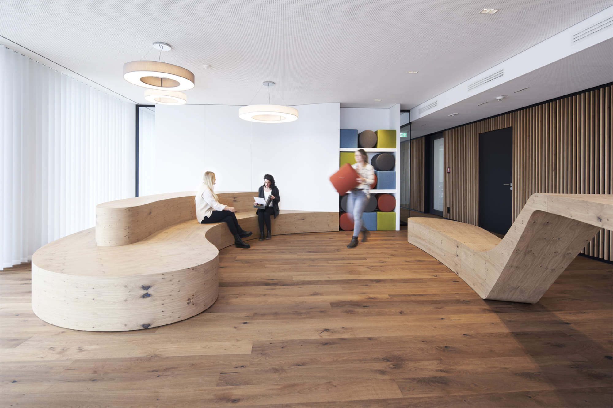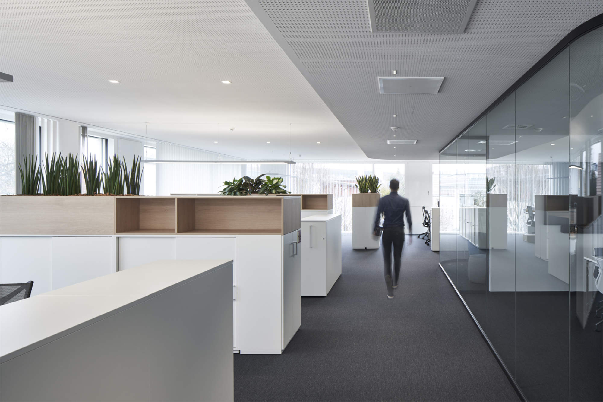 Neben Büroräumen und mobilen Arbeitsplätzen gibt es einen neuen Haupteingang mit Empfangsbereich und einen großen Showroom zur Produktpräsentation. Weiterhin laden großzügige Schulungs- und Meetingräume sowie Kreativ-Inseln zum Austausch mit den Kollegen ein. Fokusräume bieten Rückzugsmöglichkeiten für Online-Meetings oder Ruhearbeit.