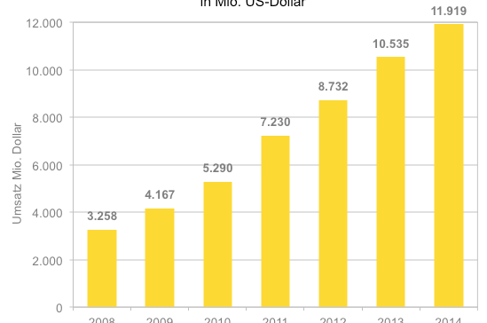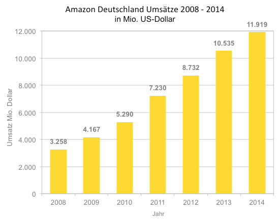Amazon Deutschland: Im Annual Report zum 31. Dezember 2014 hat Amazon erneut seinen Umsatz hierzulande ausgewiesen. Im vergangenen Jahr betrugen die Deutschland-Erlöse des Onliners 11,9 Milliarden US Dollar. Dies entspricht auf Dollar-Basis einem Plus von 13,1 Prozent. Bereinigt um den Euro-Währungsverfall dürfte das Wachstum in Deutschland noch deutlich höher ausgefallen sein. Bemerkenswert: Innerhalb von fünf Jahren konnte Amazon seinen Umsatz in Deutschland mehr als verdoppeln. 2010 betrug dieser gerade mal knapp 5,3 Milliarden US-Dollar.