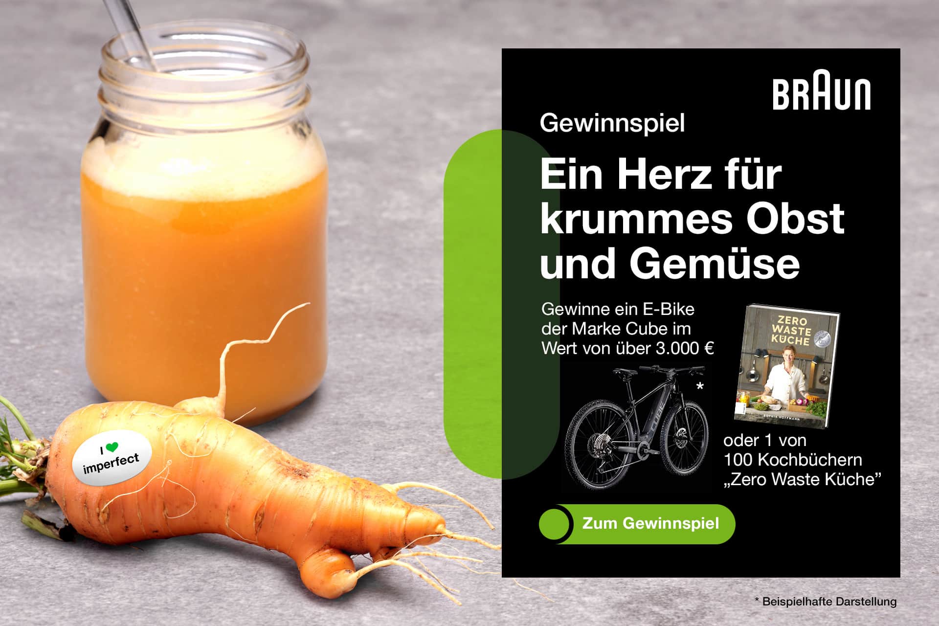 Zusätzliche Anreize bietet eine Gewinnspielaktion. Dabei haben Teilnehmende die Chance auf ein E-Bike im Wert von mehr als 3.000 Euro oder eines von 100 Kochbüchern der „Zero Waste Küche“ von Sophia Hoffmann. Zur Teilnahme am Gewinnspiel muss man nur den Newsletter von Braun abonnieren und sichert sich damit bis zum 31. Oktober die Möglichkeit auf einen der Gewinne.