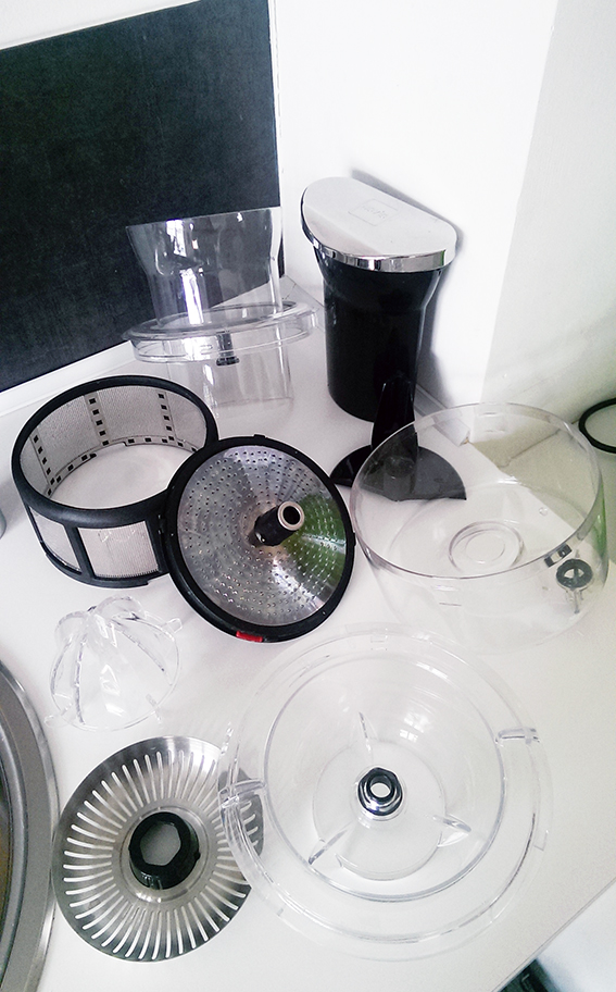 Für Orangen und Zitronen gibt es eine Zitruspresse im klassischen Sinne, für alle anderen Obst- und Gemüsesorten gibt es ein Sieb und eine dazugehörige, messerscharfe Zentrifugalscheibe, die zusammen als Entsafter fungieren. Für Smoothies ist ein Pürier Einheit beigelegt.