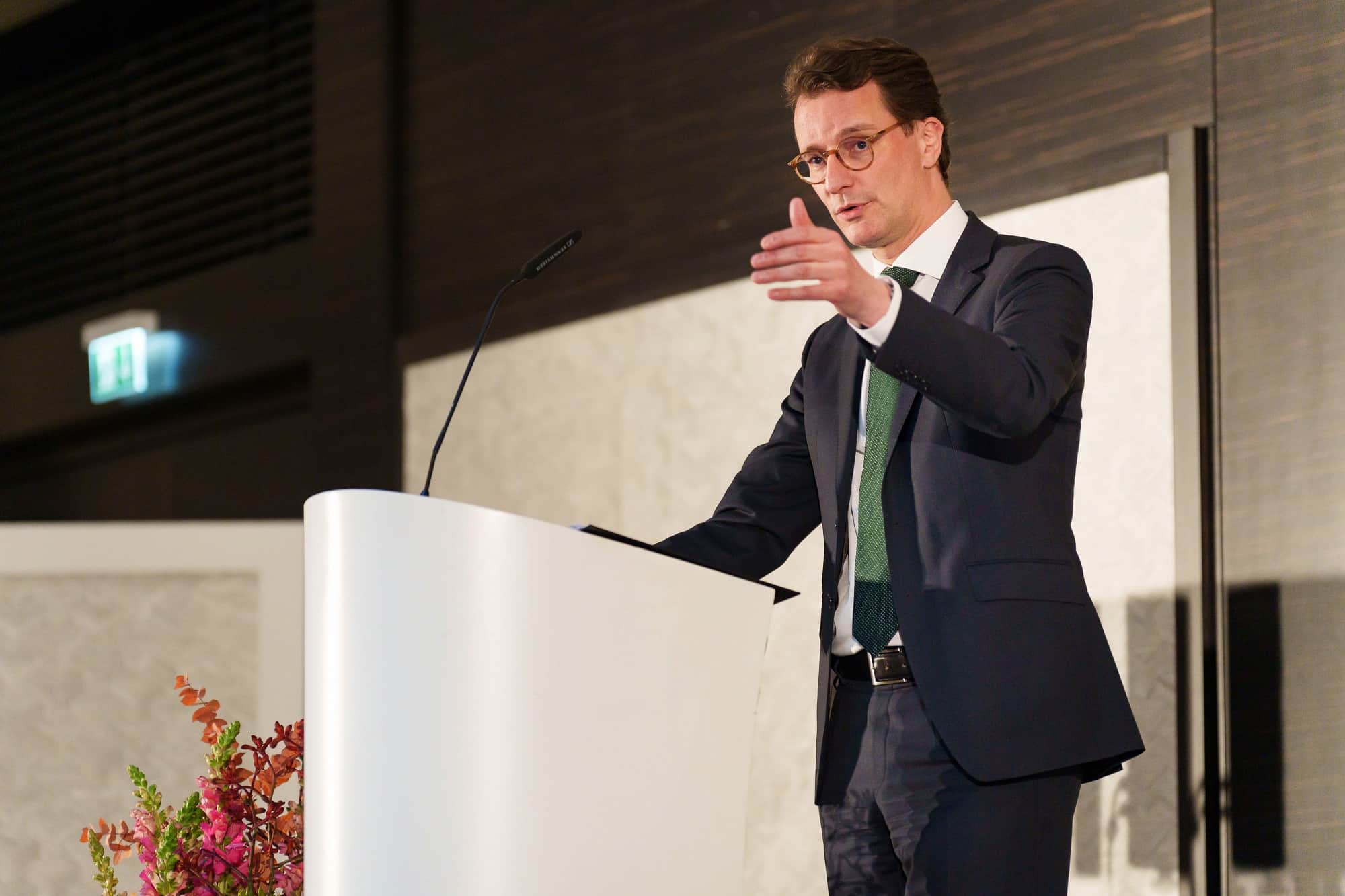 NRW-Ministerpräsident Hendrik Wüst (CDU) am 29. März in Düsseldorf anlässlich einer Rede zum Jahresempfang der Einzelhandelsverbände in Nordrhein-Westfalen.