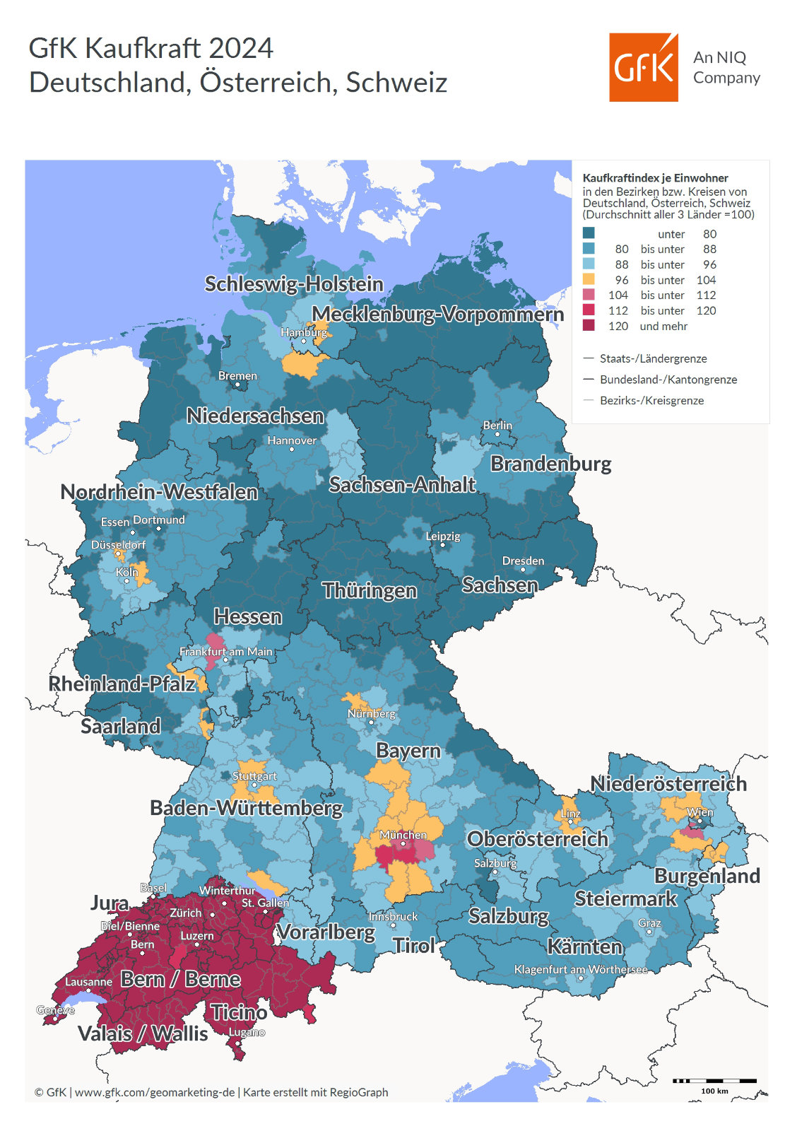 Laut Prognose von GfK beläuft sich die Kaufkraftsumme in der Schweiz bei mehr als 8,8 Mio. Einwohnern im Jahr 2024 auf insgesamt 463,4 Mrd. EUR (ohne Liechtenstein). In Österreich kommen die mehr als 9,1 Mio. Einwohner auf eine Gesamtsumme von rund 266,5 Mrd. EUR, während die Gesamtkaufkraft der in etwa 84,4 Mio. Deutschen 2.349,2 Mrd. EUR beträgt.