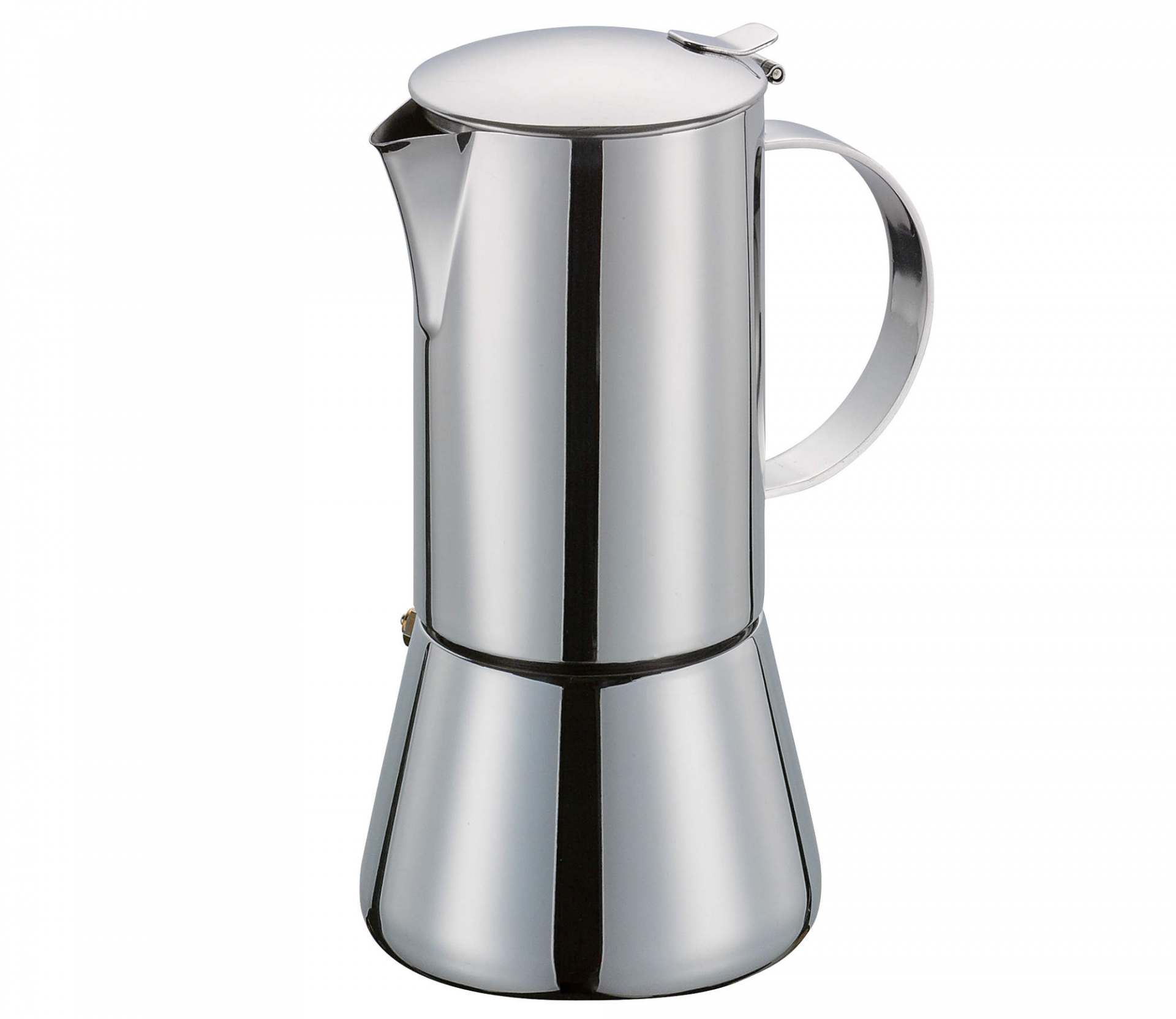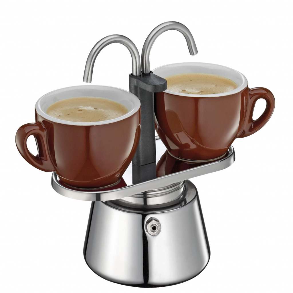 Due Espressi? Auch kein Problem, denn Caffettiera“ liefert zuverlässig. Das Modell hat einen induktionsgeeigneten Boden und eine weitere Besonderheit: Der Espresso läuft direkt in die Tassen. Das Wasser und der mit Espressopulver gefüllte Trichter befinden sich, wie üblich, im unteren Teil des Kochers. Der obere Teil besteht aus einer Plattform und zwei Ausgüssen. Stellen Sie den Kocher samt Tassen, unter jeden Ausguss eine, da der Espresso an beiden Seiten hinausläuft, auf den Herd und schalten Sie die Kochplatte an. So stilvoll kann Kaffeegenuss sein! Geeignet für alle Herdarten inklusive Induktion.