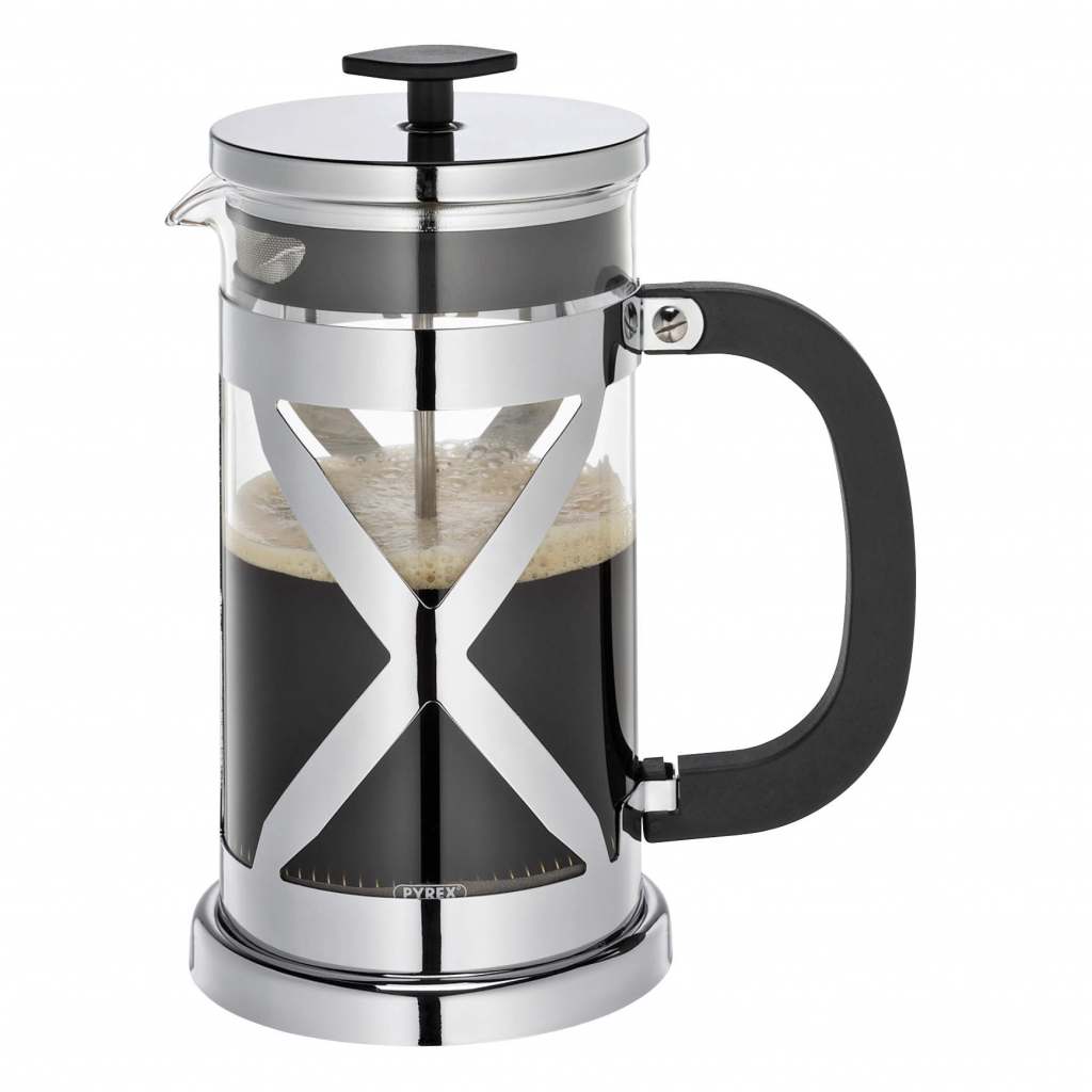 Nicht zu vergessen noch eine Kanne für den Frenchpress. „Gloria“ ist aus hitzebeständigem Borosilikatglas. In die Kanne füllt man grob gemahlenes Kaffeepulver, dann gießt man heißes, aber nicht mehr kochendes Wasser darüber und setzt den Deckel auf die Kanne. Nach einer Ziehzeit von mindestens vier Minuten drücken Sie den Filterstab langsam herunter. Fertig! Je nachdem, wie groß die Kaffeerunde ist, greifen Sie zu dem Modell für drei oder acht Tassen. Die Zubereitung von Tee funktioniert übrigens genauso unkompliziert. Da ist „Gloria“ absolut flexibel.