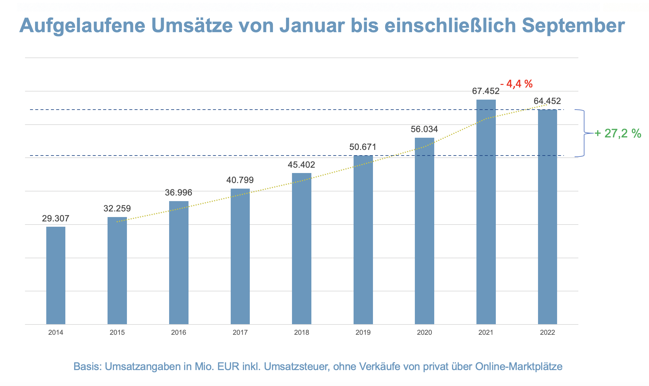 Ein Rückfall auf das Niveau von vor der Pandemie ist laut des Bundesverbands E-Commerce und Versandhandel Deutschland (bevh) dennoch nicht erkennbar: Die aufgelaufenen Umsätze der ersten drei Quartale dieses Jahres liegen 4,4% unter dem Vergleichszeitraum des Vorjahres, aber 15% über dem Vergleichszeitraum des Jahres 2020 und noch immer 27,2% über dem Vergleichszeitraum des Jahres 2019.