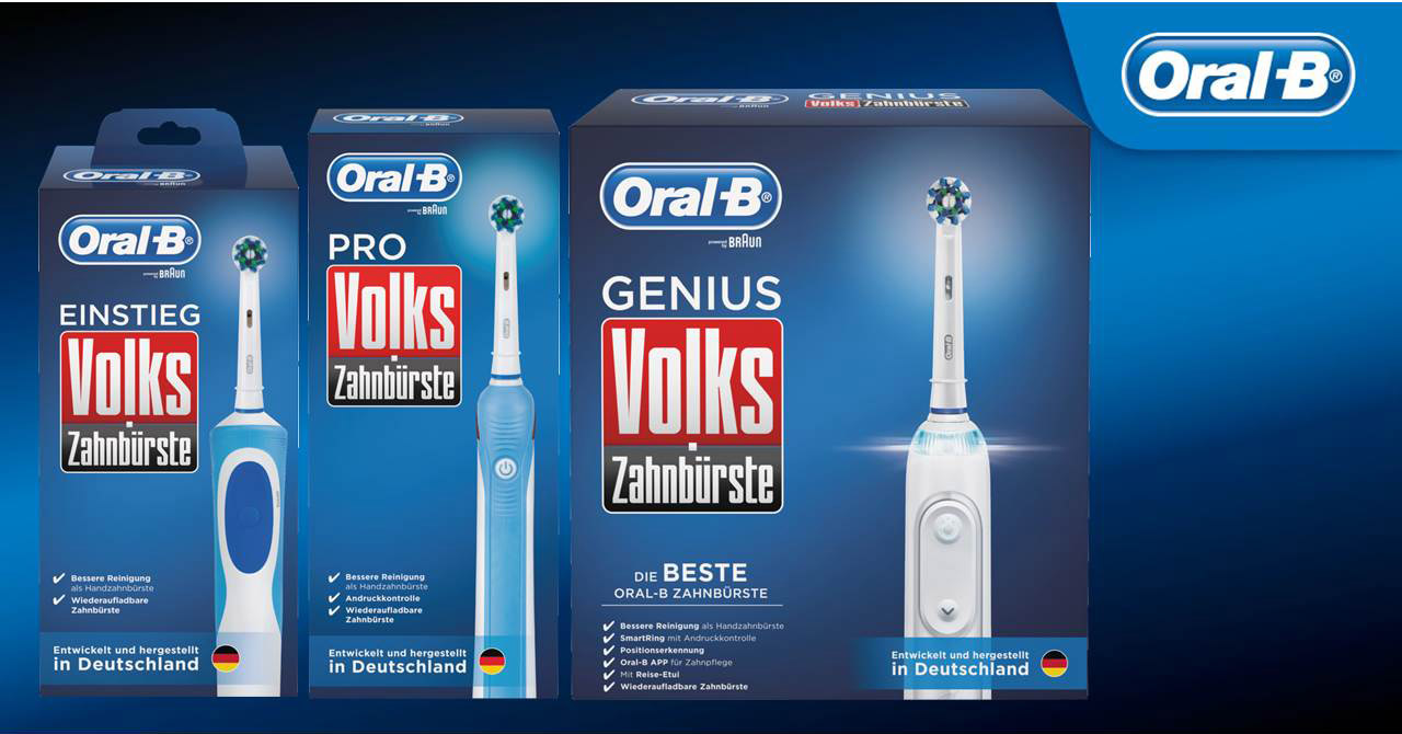 Die Oral-B Einstieg ist der ideale Start in die elektrische Zahnpflege. Die Oral-B Pro und Genius verfügen beide über die innovative OR-Technologie mit rotierenden und pulsierenden Bewegungen des Bürstenkopfes, die so 100% mehr Plaque als herkömmliche Handzahnbürsten entfernen sollen. Oral-B unterstützt die Kampagne mit TV-, Online- und Printwerbung.