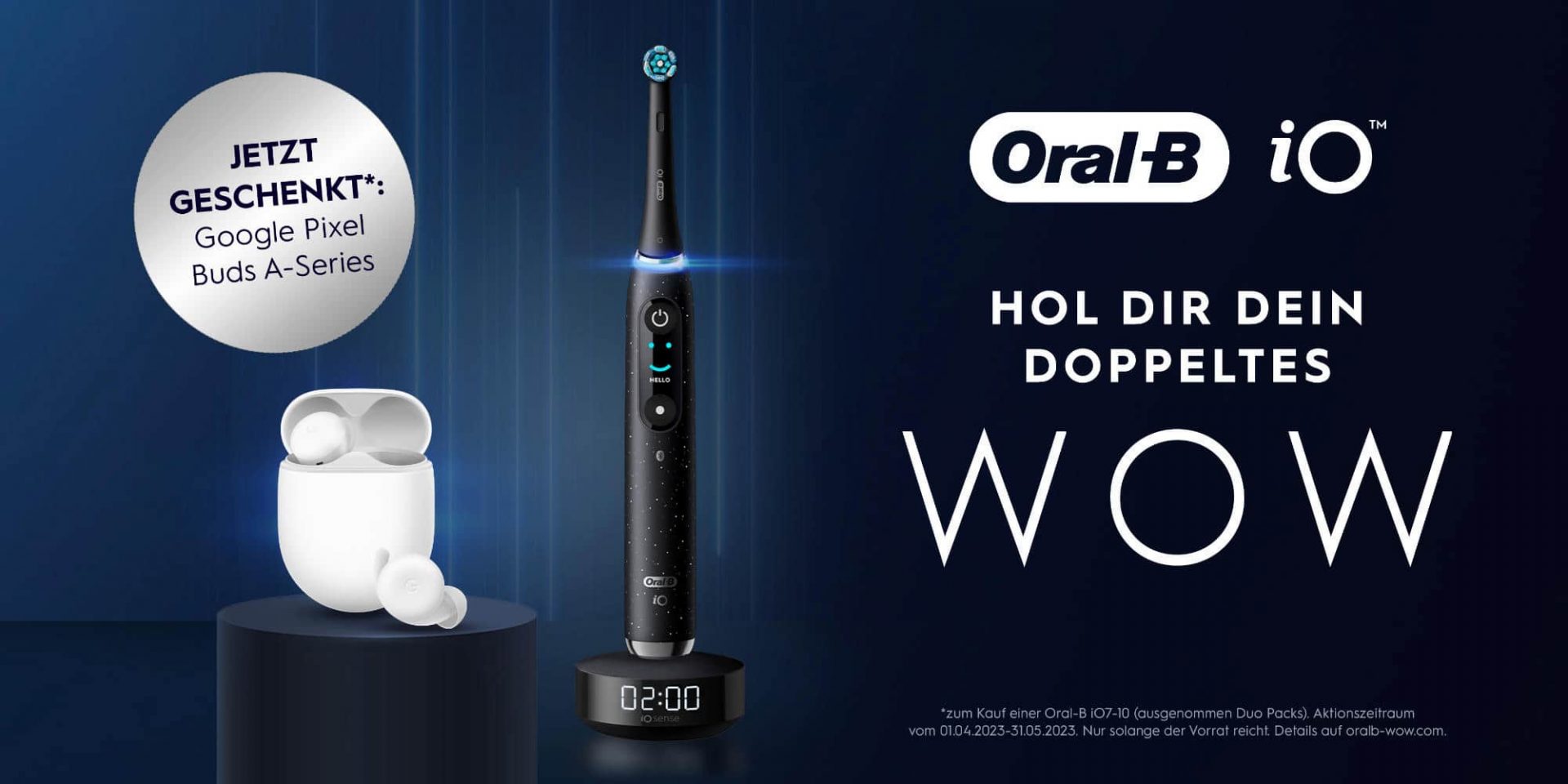 Das aktuelle „Wow“-Angebot von Oral-B rund um seine elektrischen Premium-Zahnbürsten verwöhnt auch die Ohren. Wer bis zum 31. Mai 2023 eine Oral-B iO Serie 7 bis 10 kauft, erhält die Bluetooth-Kopfhörer Pixel Buds A-Series von Google als Geschenk dazu.