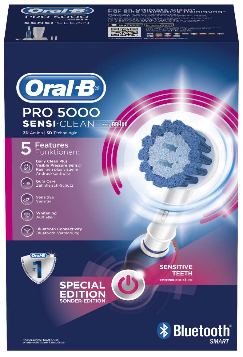 Wer sensible Zähne und empfindliches Zahnfleisch hat, findet mit der Bluetooth- fähigen Pro 5000 SmartSeries Sensi-Clean mit Sensitive-Aufsteckbürste den idealen Zahnputzpartner. Bei der limitierten Pro 5000 SmartSeries 3D White entfernt der Poliereinsatz im 3D White-Bürstenkopf unschöne Oberflächenverfärbungen und bringt das natürliche Weiß der Zähne zur Geltung. Die Sondereditionen der Pro 5000 SmartSeries verfügen über vier Reinigungsmodi: tägliches Reinigen, Zahnfleisch-Schutz, Sensitiv und Aufhellen. Zusätzlich ermöglicht die interaktive Zahnbürste die Kommunikation mit dem Smartphone und der Oral-B Zahnpflege-App.