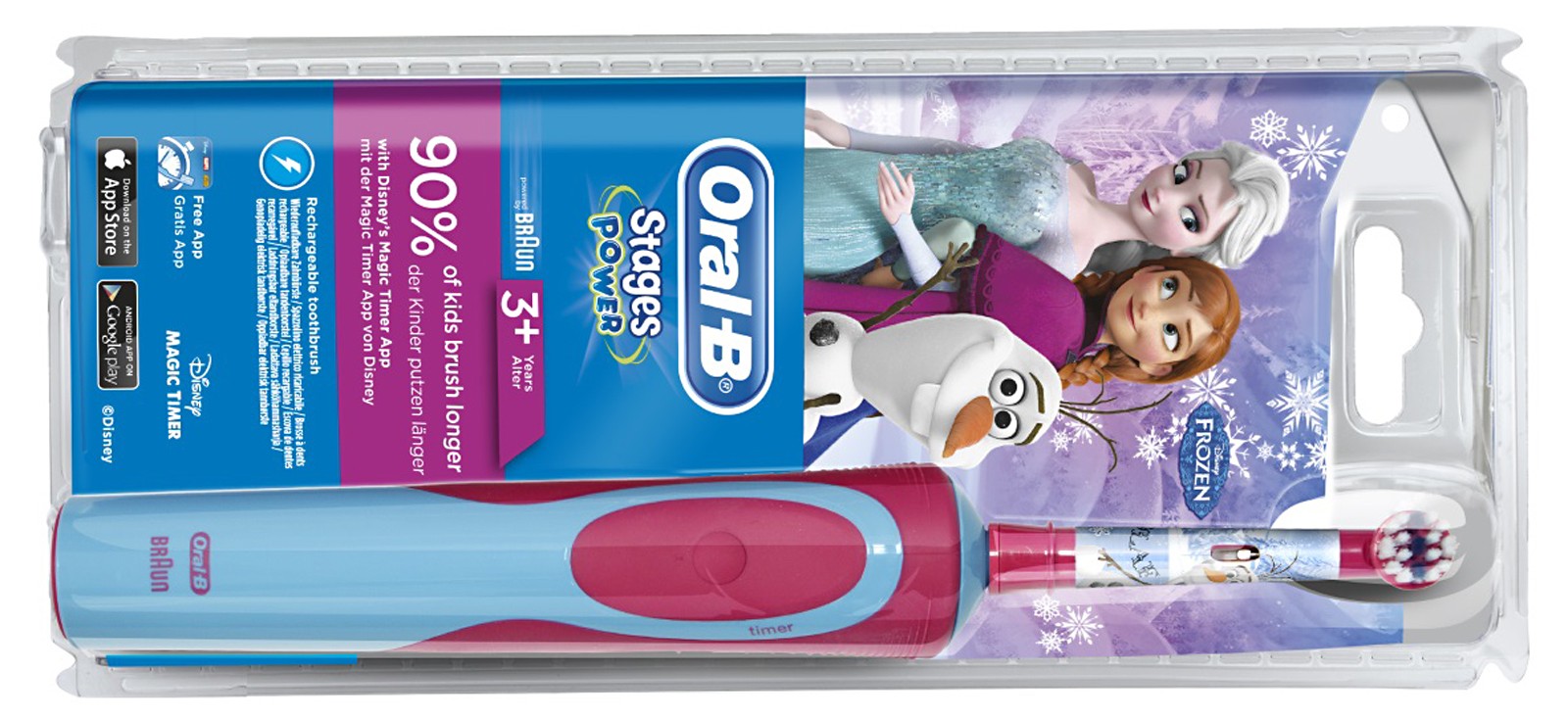 Die Oral-B Zahnbürste Kids Die Eiskönigin ist eine Variante der Zahnbürste Oral-B Stages Power. Die Eiskönigin gibt es mit den „coolen“ Helden des frostigen Kinoabenteuers. Die elektrische Oral-B Stages Power Zahnbürste, mit besonders weichen Borsten, kann in Verbindung mit der Disney Magic Timer App genutzt werden, die gratis für iOS und Android verfügbar ist und Kinder beim Putzen spielerisch motiviert sowie anleitet. Die App signalisiert u.a. mit Musiktimer den Wechsel von Ober- zu Unterkiefer.