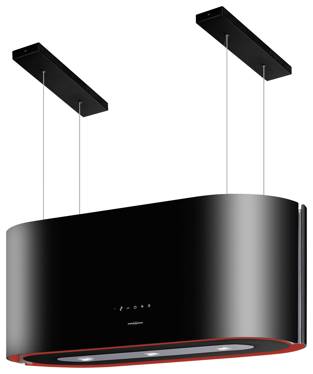 Die Oranier Dunstabzugshaube Santina Isola ist ein frei schwebendes Design-Objekt, erhältlich in den klassischen Trendfarben Schwarz oder Weiß. Aufgehängt ist das Gerät an filigranen Stahlseilen. Der Sicherheitsglasschirm ist an den Längsseiten leicht gebogene. Die Beleuchtung erfolgt in warmem Weiß mit drei LED, mit einer Leistung von jeweils nur drei Watt.