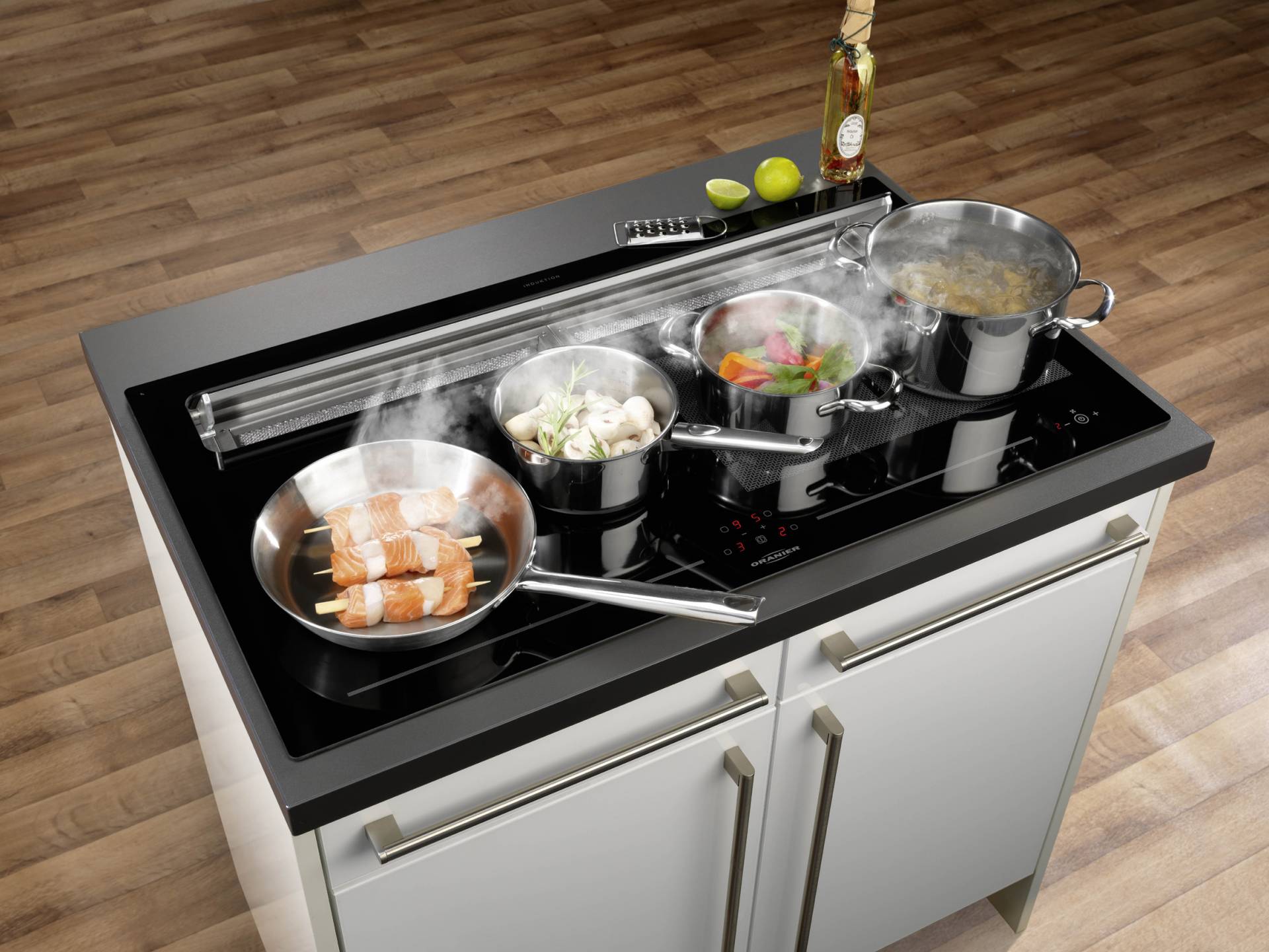 So auch bei weiteren Ausstattungsmerkmalen: rote Display-Anzeigen, zehn Leistungsstufen je Kochzone, vierfacher Booster, vierfacher Timer bis zu 99 Minuten, Topf- und Topfgrößenerkennung sowie eine manuelle Brückenschaltung, welche die beiden rechten Kochzonen zur Bräter-Zone verbindet. Übrigens werden sowohl ein Abluft- als auch ein Umluft-Modul angeboten ? wobei letzteres über einen Profi-Aktivkohle-Filter verfügt, der bis zu fünfmal regeneriert werden kann und eine Nutzungsdauer von bis zu 3 Jahren hat.