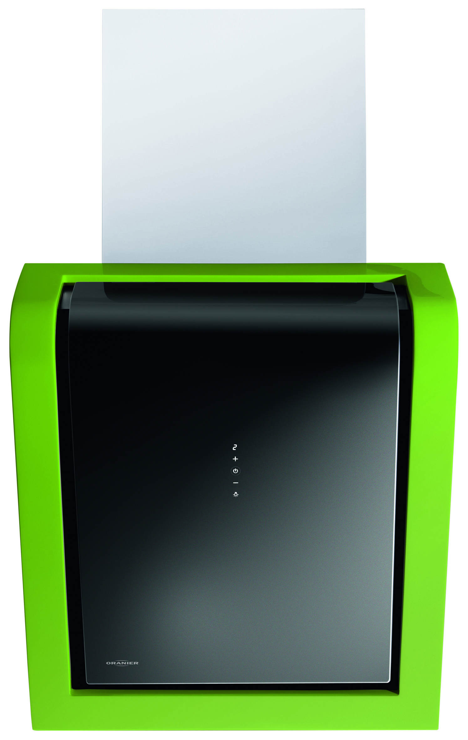 Die Frontansicht zeigt einen gebogenen Sicherheits-Glasschirm, der über einen zweifachen Liftbeschlag und Scharniere mit dem Körper der Haube verbunden ist. Der Glasschirm wird durch einen Wechselrahmen aus Fiberglas eingefasst, der in den Farben Weiß, Schwarz, Lindgrün, Rot und Magnolie erhältlich ist und sich auch noch nachträglich auswechseln lässt, sodass die Haube an zukünftige Farbtrends oder veränderte Einrichtungsvorlieben angepasst werden kann.