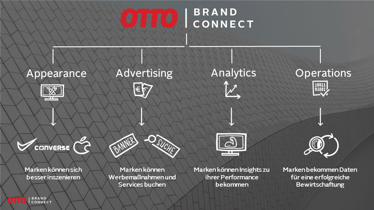 Ein elementarer Baustein der Plattformentwicklung ist das neue Partner-Portal „Brand Connect“, die Anbindung von neuen Partnern und Marken auf otto.de. Das Self-Service-Tool, das in Zusammenarbeit mit Marken wie adidas oder s.Oliver entwickelt wird, soll in naher Zukunft alle für Markenanbieter relevanten Prozesse und Services bündeln – Analytics, Bewirtschaftung, Operations etc. Partner können damit mittelfristig eigene Markenshops bauen, Werbemittel buchen und Verkaufszahlen in Echtzeit einsehen.