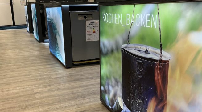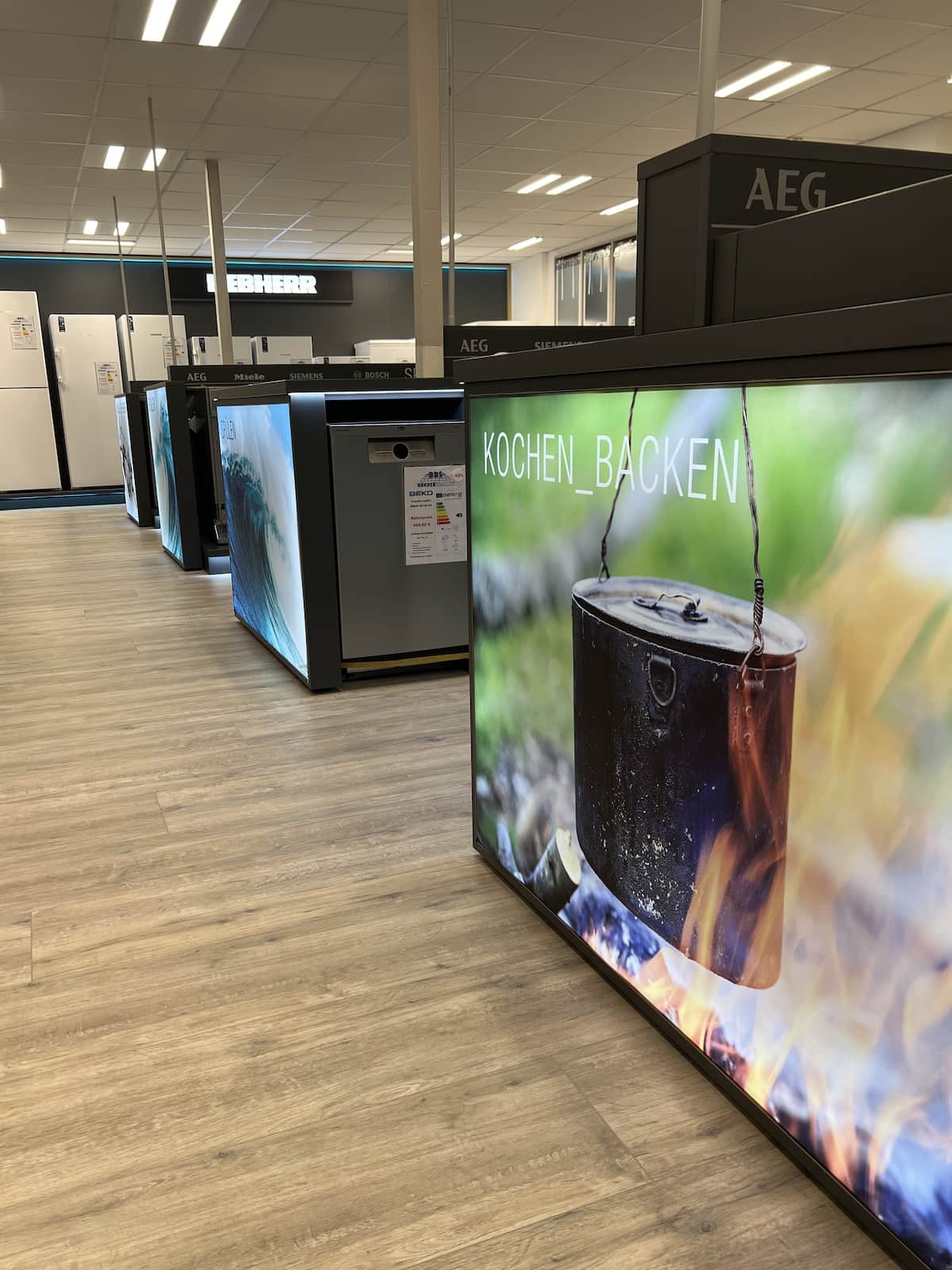 Bevor der neue Markenstore jetzt an den Start geht, erfolgte der komplette Umbau des Standortes. Neue Böden, die neue Hausgeräte Ausstellung mit Premium-Ladenbauelementen, die neue Küchenausstellung, neue Decken und Beleuchtungssysteme – innen blieb sprichwörtlich kein Stein auf dem anderen. Und auch außen zieht die Fassadengestaltung im Konzept-Style die Blicke auf sich – ganz besonders die große LED-Video-Wall auf dem Dach.