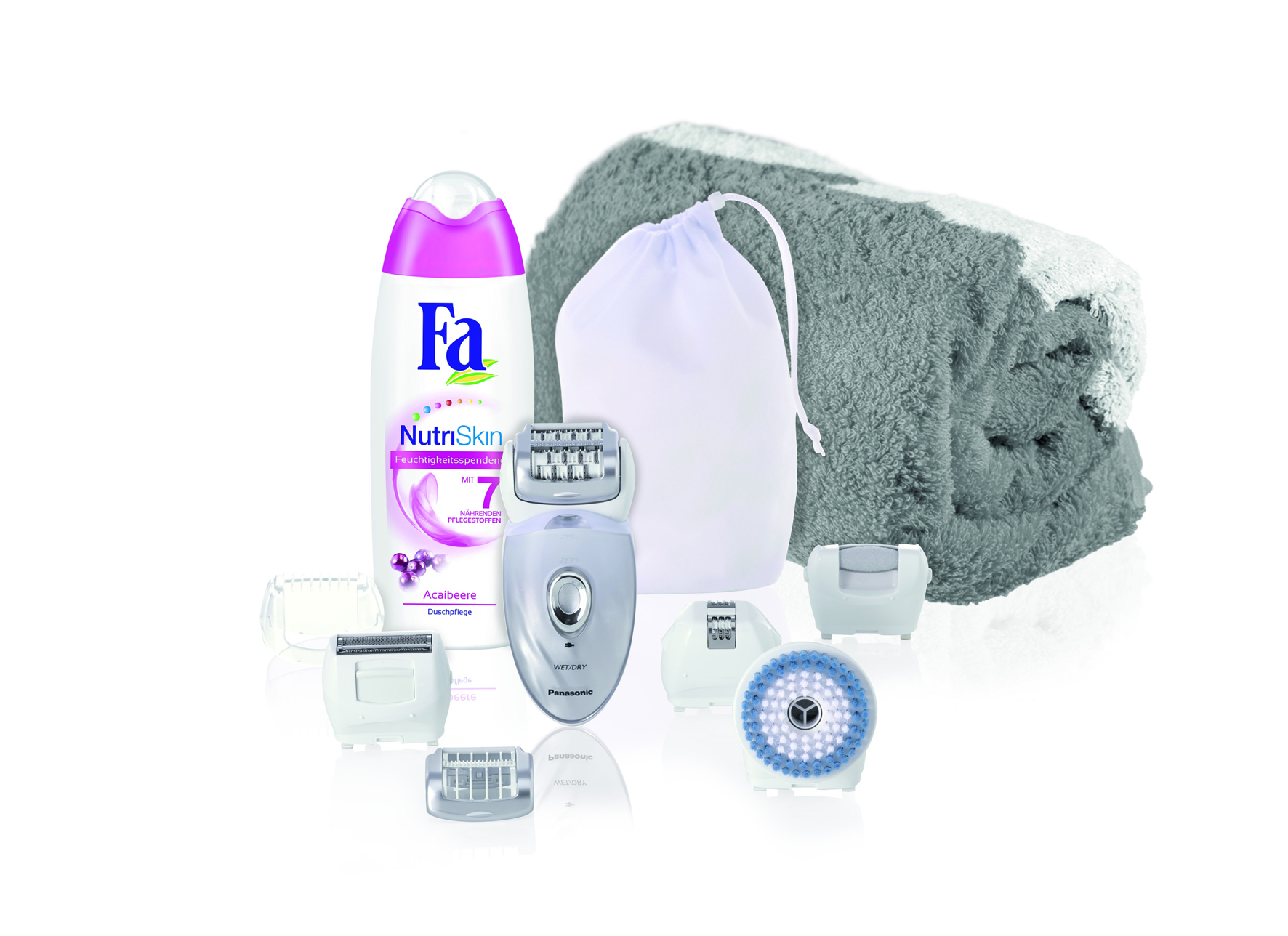 Der Panasonic Epilierer ES-ED94 Wet/Dry wird als eine Limited Edition angeboten. Der 7in1-Nass-/Trocken-Epilierer in stylish-elegantem Silber-Weiß kommt im Verwöhn-Komplettpaket inklusive der Fa Duschcreme Acaibeere und eines flauschigen Strandlakens von Möve in den Handel.