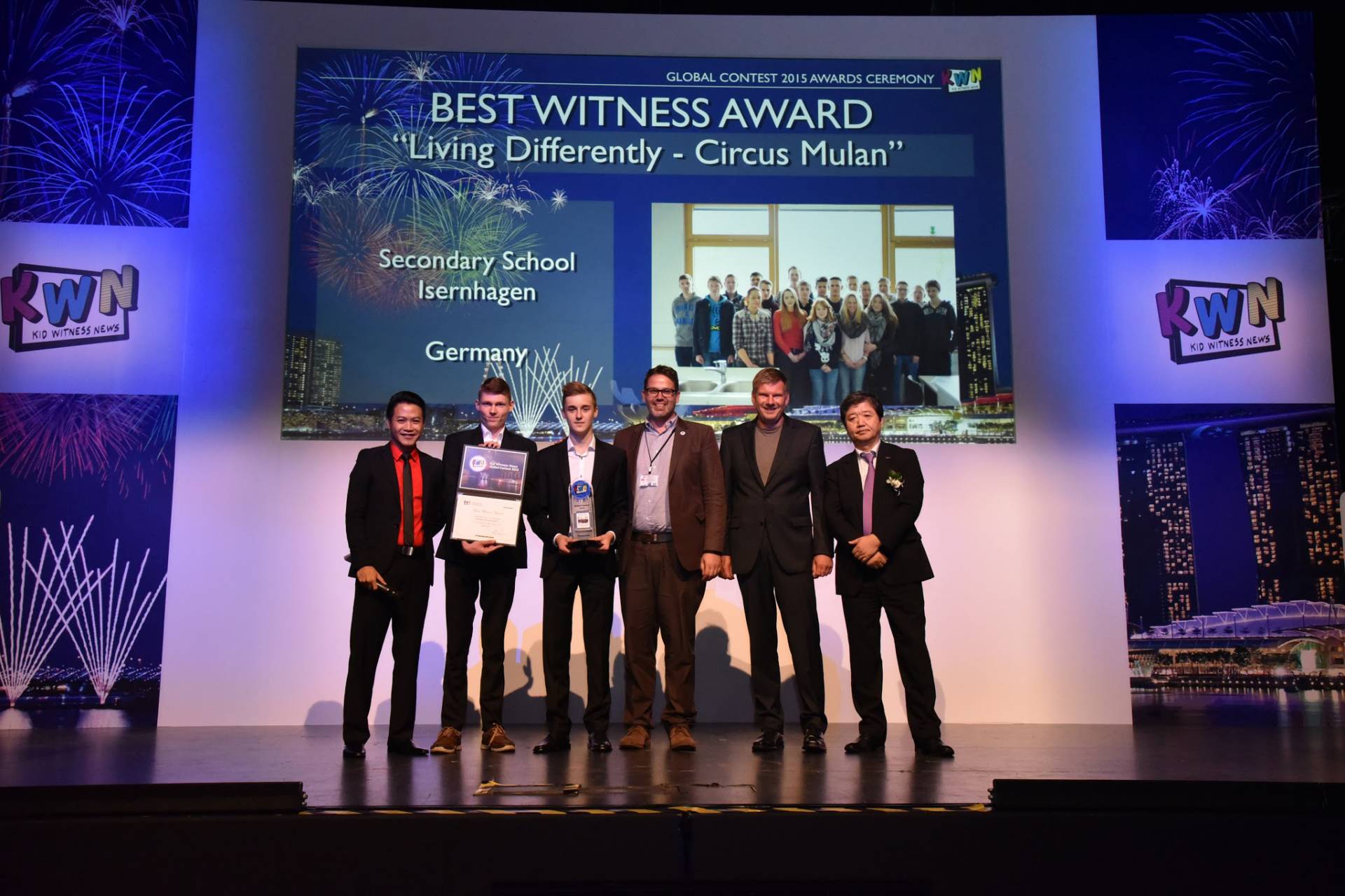 Mit ihrer Dokumentation „Circus Mulan“ haben die Schüler der Realschule Isernhagen den Preis in der Kategorie „Best Witness“ gewonnen. Ende August wurden alle Finalisten im Rahmen einer Preisverleihung in Singapur feierlich geehrt. Die Sieger des Abends kamen aus Thailand vom Montfort College – die Schüler überzeugten die Jury mit einem Beitrag über ein sehbehindertes Mädchen und erhielten den Grand-Prix Preis und die Auszeichnung für das beste Konzept.