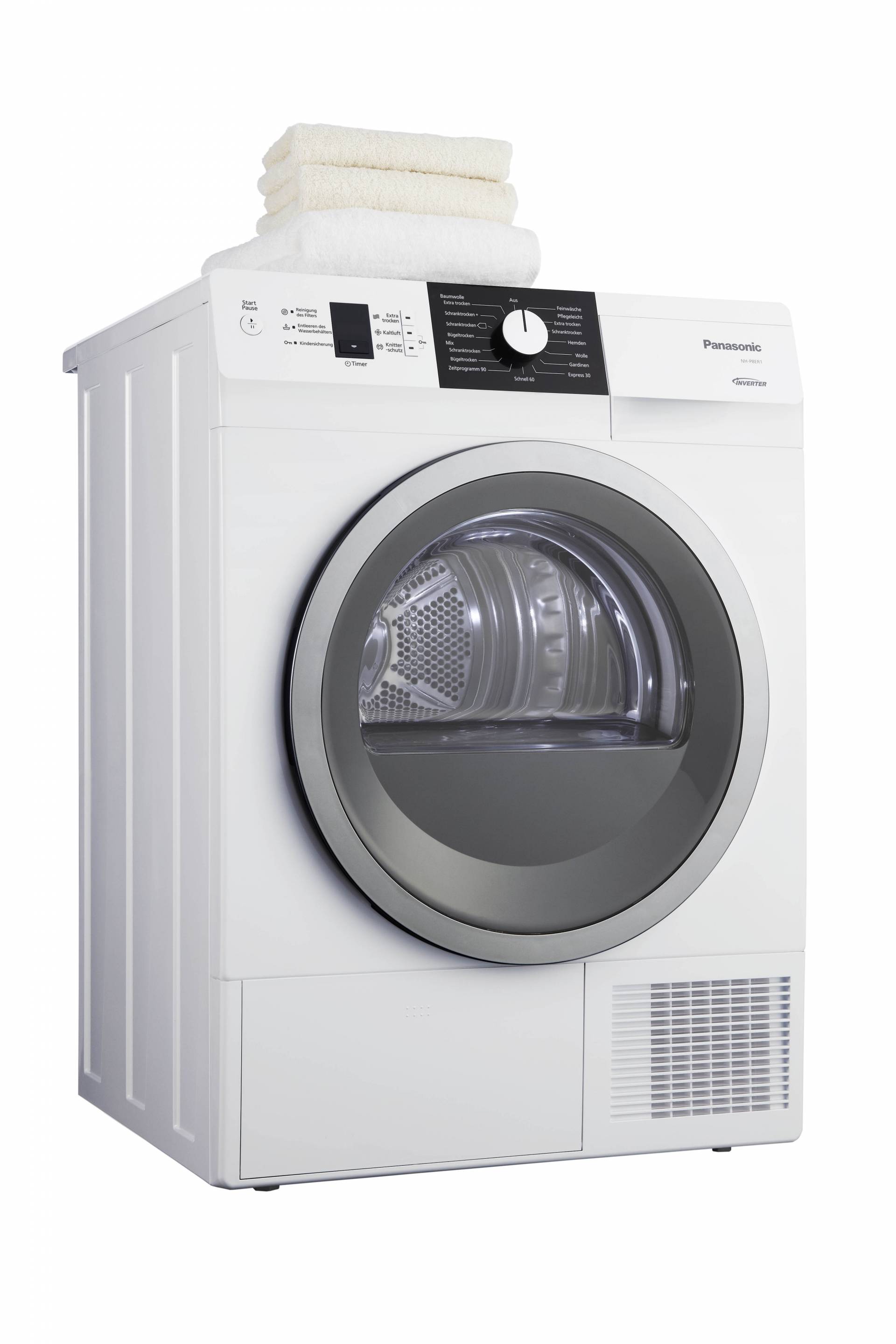 Der Panasonic Wärmepumpentrockner NH-P8ER1 setzt gleich mehrere Ausrufezeichen auf einmal. Mit vielen technischen Innovationen erfüllt der Panasonic Wärmepumpentrockner NH-P8ER1Kundenwünsche in Serie: Erstklassige Energiebilanz dank zuverlässigem Inverter und umweltbewusster Wärmepumpen-Technologie, 15 vielseitige Trocknungsprogramme, 8kg Ladekapazität, viele wäscheschonende Funktionen und der flüsterleise Betrieb machen aus einem klassischen Haushaltgerät einen unverzichtbaren Helfer bei der täglichen Arbeit.