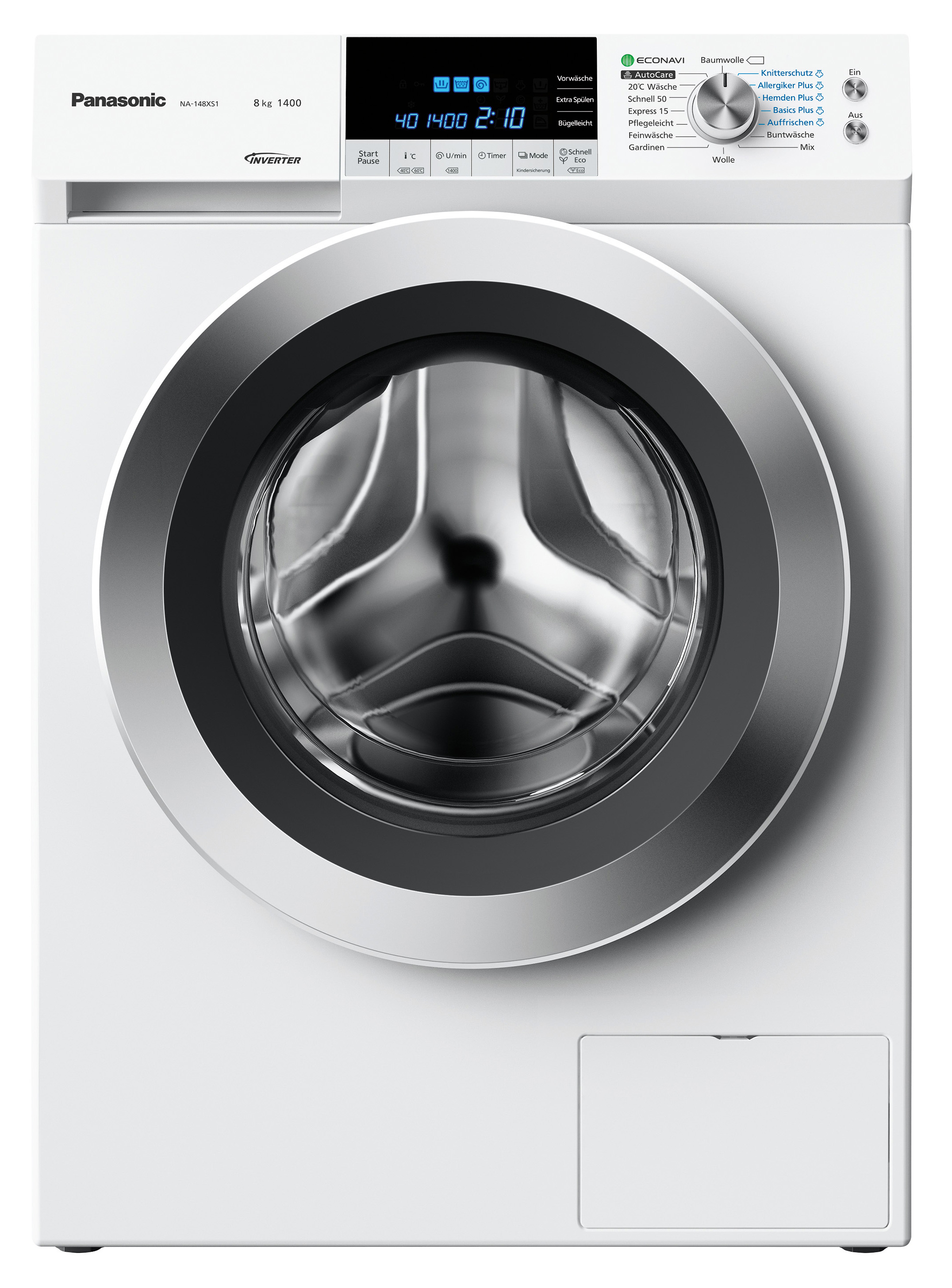 Die Panasonic Waschmaschine NA-148XS1 bietet mit AutoCare eine Programmautomatik für die Alltagswäsche. Mit Hilfe von vier intelligenten Sensoren optimiert das A+++ Geräte der 8 kg-Klasse eigenständig den Programmablauf für die aktuelle Ladung.