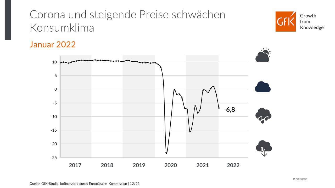 „Die Konsumstimmung wird auch zum Jahresende von zwei Seiten stark unter Druck gesetzt. Hohe Inzidenzen durch die vierte Welle der Corona-Pandemie mit weiteren Beschränkungen sowie deutlich gestiegene Preise setzen dem Konsumklima mehr und mehr zu. Vor allem die 2G-Regel für weite Teile des Einzelhandels versetzen dem Weihnachtsgeschäft einen schweren Schlag“ erklärt Rolf Bürkl, GfK Konsumexperte. „Auch die Aussichten für den Beginn des kommenden Jahres sind vor dem Hintergrund der rasanten Ausbreitung der Omikron-Variante gedämpft.“