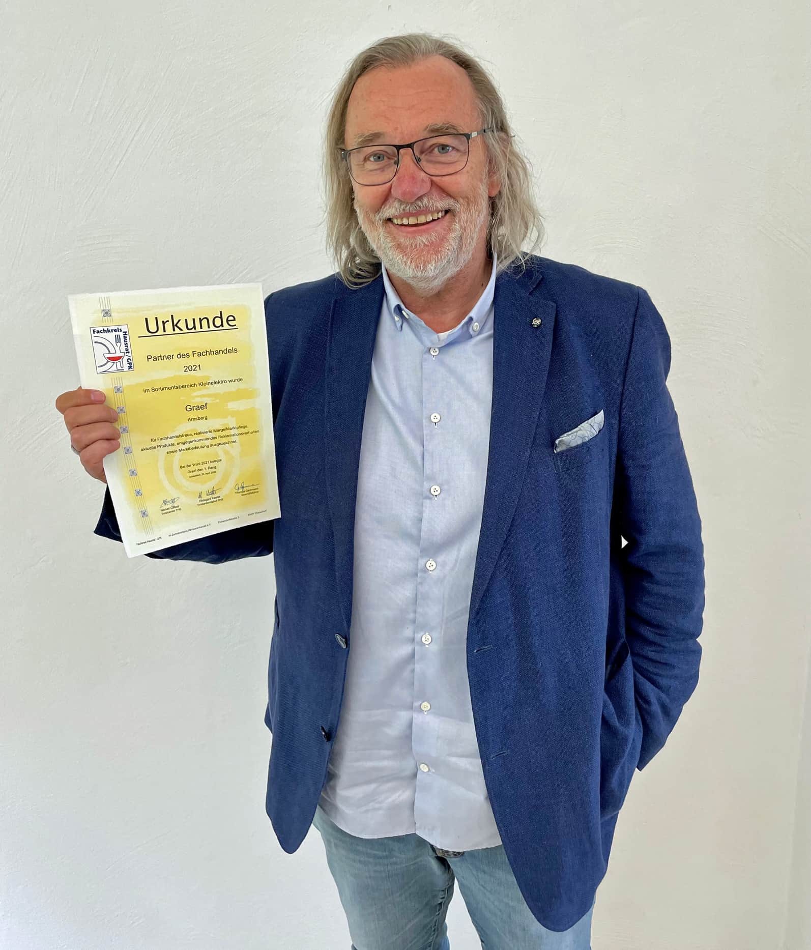 Über das beste Durchschnittsergebnis, 2,33, freut sich Geschäftsführer Hermann Graef: „Auch im Coronajahr 2021 konnten wir uns in der anhaltenden pandemischen Situation als zuverlässiger und profitabler Handelspartner beweisen. Dass wir nun von unseren Handelspartnern zum ‚Partner des Fachhandels 2021‘ gewählt wurden, macht uns besonders stolz.“