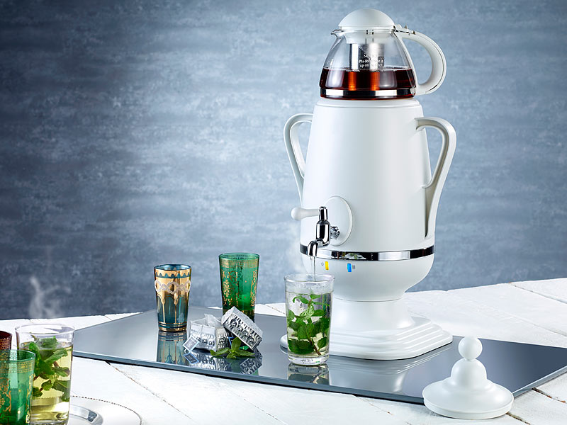 - Samowar inklusive Glas-Teekanne, Teesieb, Dampfeinsatz, Deckel und deutscher Anleitung