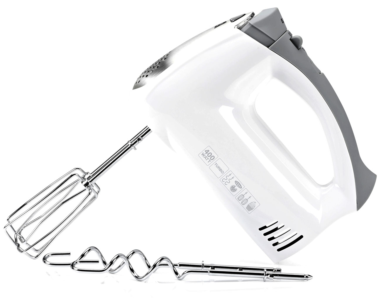 Der Petra Handmixer HM 11.00 kann Kneten, Aufschlagen und Rühren. Das 400 Watt starke Gerät besitzt fünf verschiedene Leistungsstufen und eine Turbo-Funktion. Zusätzlich kann, je nach Schwere des Teiges, zwischen den Knethaken und dem Quirl gewechselt werden. Die zu Teilen gummierte Oberfläche garantiert eine bequeme Handhabung und sorgt für einen sicheren Halt bei der Anwendung.