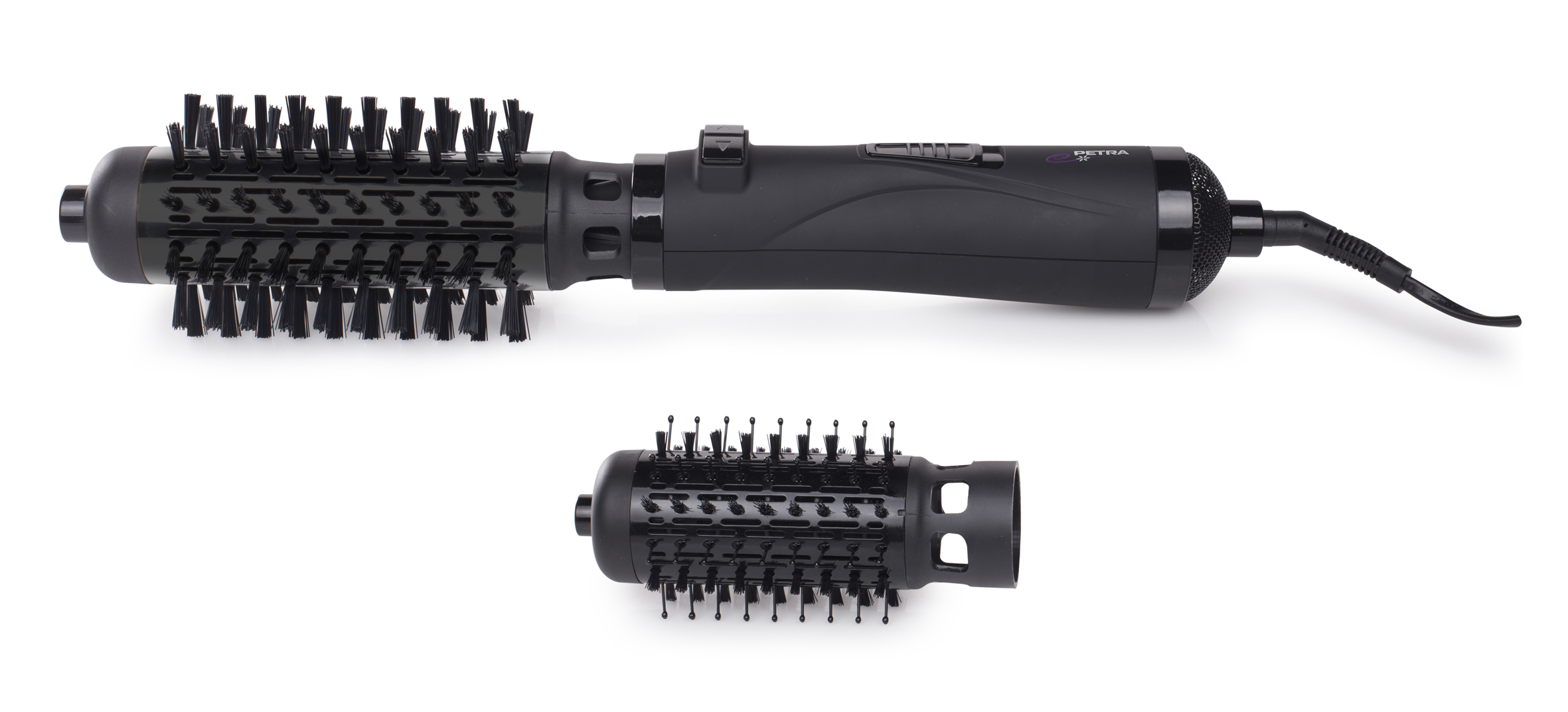 Die Petra Heißluftbürste Pro CC 70.07 Black Edition hat 1000 Watt Leistung. Sie trocknet und stylt die Haare gleichzeitig. Zwei rotierende Bürstenaufsätze mit 38 und 50 Millimeter Durchmesser ermöglichen individuelles Volumen. Die automatische Links- und Rechtsrotation bietet einen besonderen Anwendungskomfort, da sich in insbesondere der Hinterkopfbereich bequem ohne Armverrenkungen frisieren lässt.