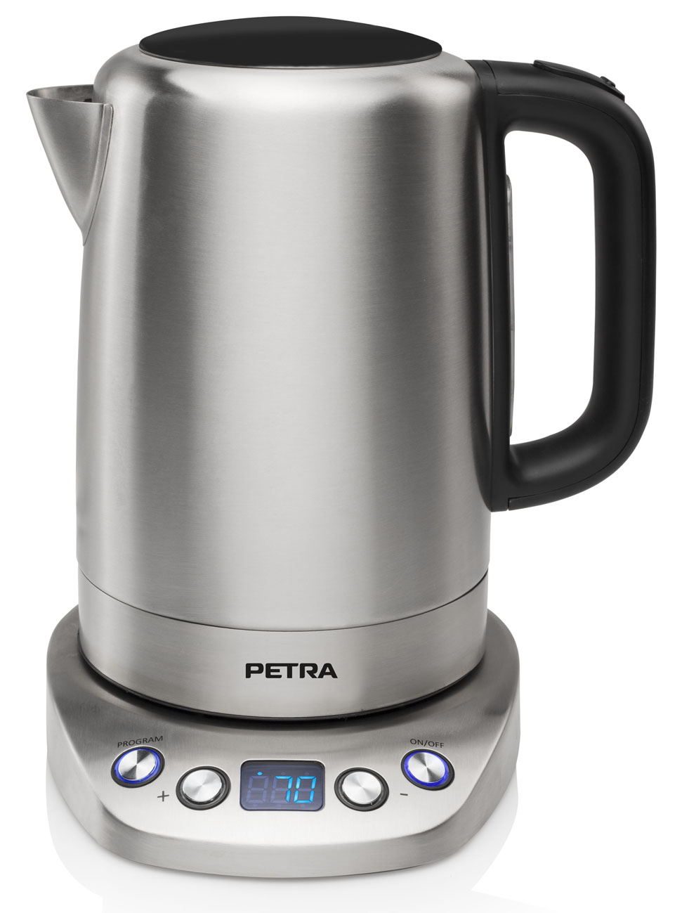 Der Petra Wasserkocher WK 54.35 besitzt einen eingebauten Thermostat. Sobald die gewünschte, angewählte Temperatur erreicht ist, schaltet sich der Wasserkocher automatisch ab. Hinzu kommt eine 360°-CentralCordless-Technik. Das Fassungsvermögen beträgt 1,7 Liter, die Leistung beläuft sich auf maximal 2200 Watt. Das Gerät hat ein verdecktes Heizelement, eine großzügige Öffnung und einen Deckel mit Sicherheitsverschluss.