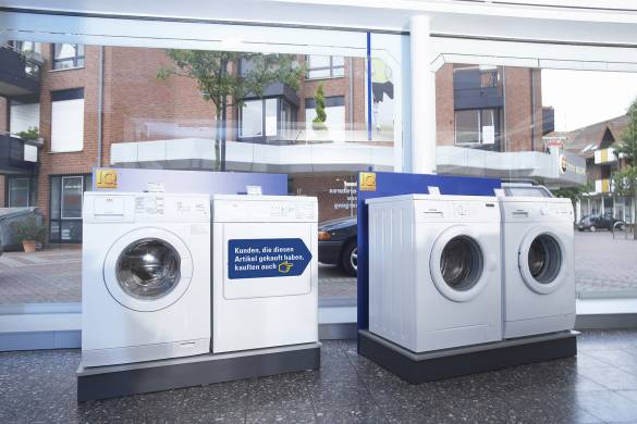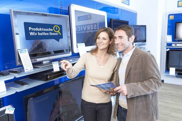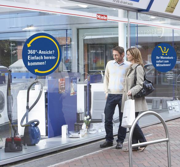 „360° Ansicht? – Einfach hereinkommen!“ „Zoom? – Einfach näherkommen!“ „Ihr Warenkorb – sofort zum Mitnehmen!“ Die markanten Sprüche stehen auf großen Adhäsionsfolien, die der IQ-(Immer Qualität) Fachhändler auf dem Schaufenster und/oder direkt auf den Produkten im Geschäft befestigen kann. Wo der Kunde im Internet alleingelassen wird und einsam vor sich hin googelt, erhält er im IQ-Fachhandel persönliche Beratung: „Produktsuche? Wir helfen Ihnen!“ steht daher auch auf einer weiteren der insgesamt sieben verschiedenen Adhäsionsfolien, die kostenlos (im Aktionspaket mit insgesamt 21 Adhäsionsfolien) an die 2.200 IQ-Fachhändler der telering-Kooperation ausgeliefert werden.