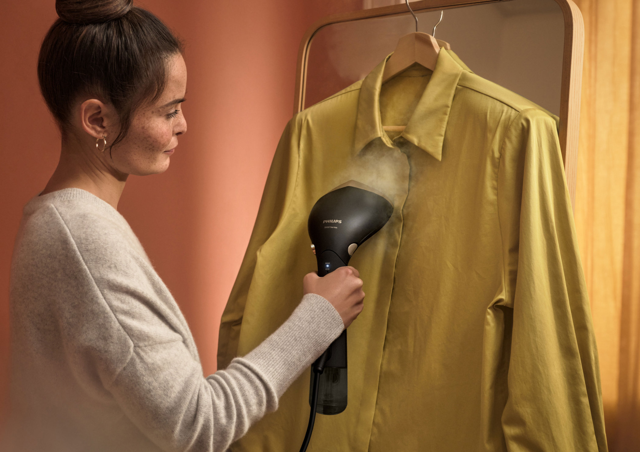 Zudem kann das Gerät in verschiedenen Modi verwendet werden: Der ECO-Modus benötigt weniger Wasser, ohne Kompromisse bei den Ergebnissen zu machen. Wenn es einmal schneller gehen soll oder besonders hartnäckige Falten nicht verschwinden wollen, sorgt der MAX-Modus für wirkungsvolle Abhilfe.