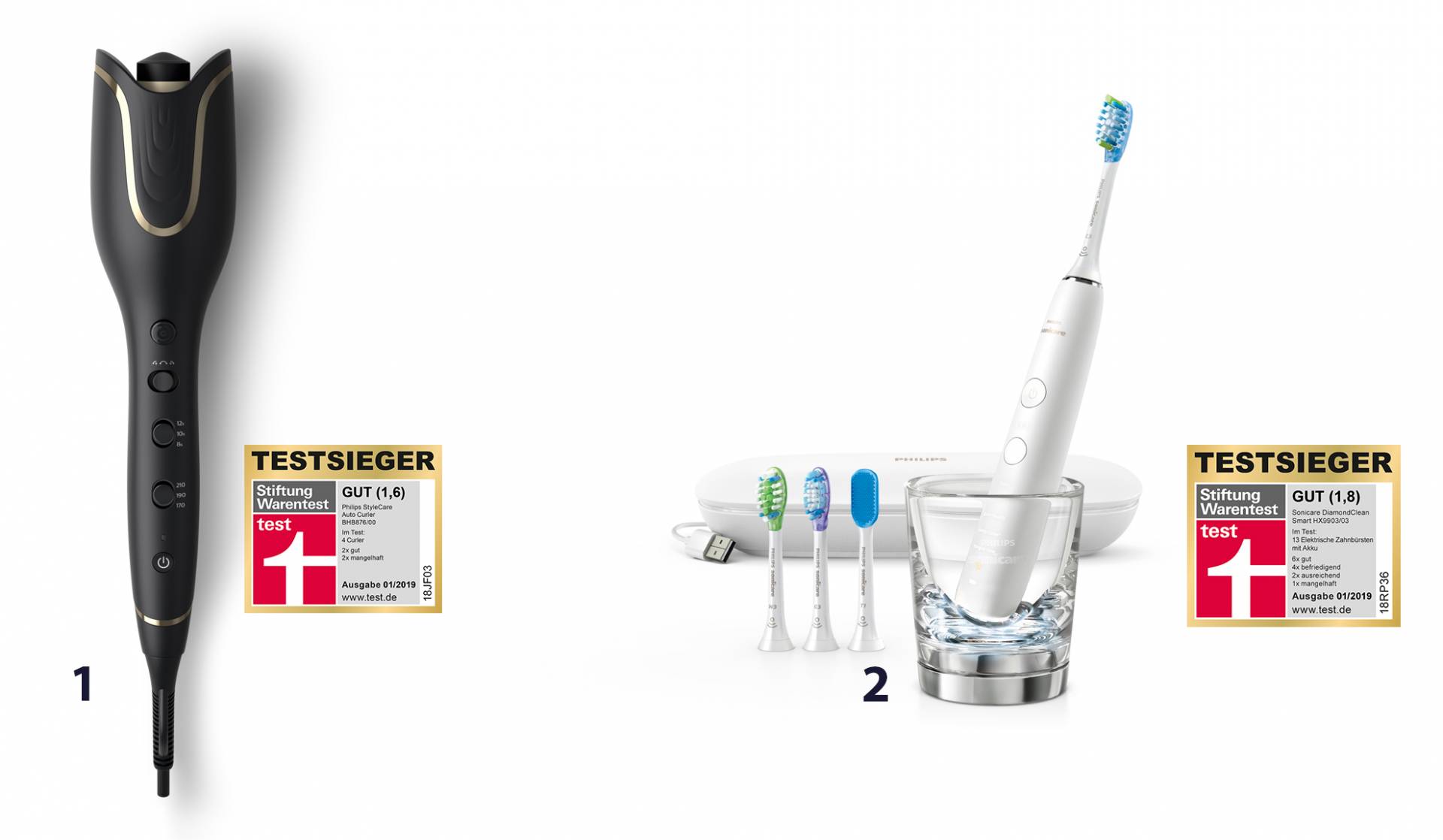 In der Ausgabe 1/2019 des Magazins „test“ der Stiftung Warentest wurden gleich zwei Produkte von Philips zum Testsieger gekürt: Der StyleCare Auto Curler (Note 1,6) wurde Testsieger im Bereich Curler/Lockenstäbe, die Sonicare DiamondClean Smart Schallzahnbürste (Note 1,8) wurde Testsieger im Bereich elektrische Zahnbürsten. Beide Produkte überzeugten die Tester durch ihre leichte Bedienbarkeit und Effektivität.