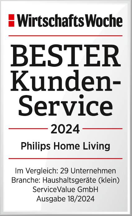 In einer unabhängigen Umfrage des Wirtschaftsmagazins „WirtschaftsWoche“ geht der Philips Kundenservice als Branchengewinner von 29 Unternehmen in der Kategorie „Haushaltsgeräte Klein“ hervor.