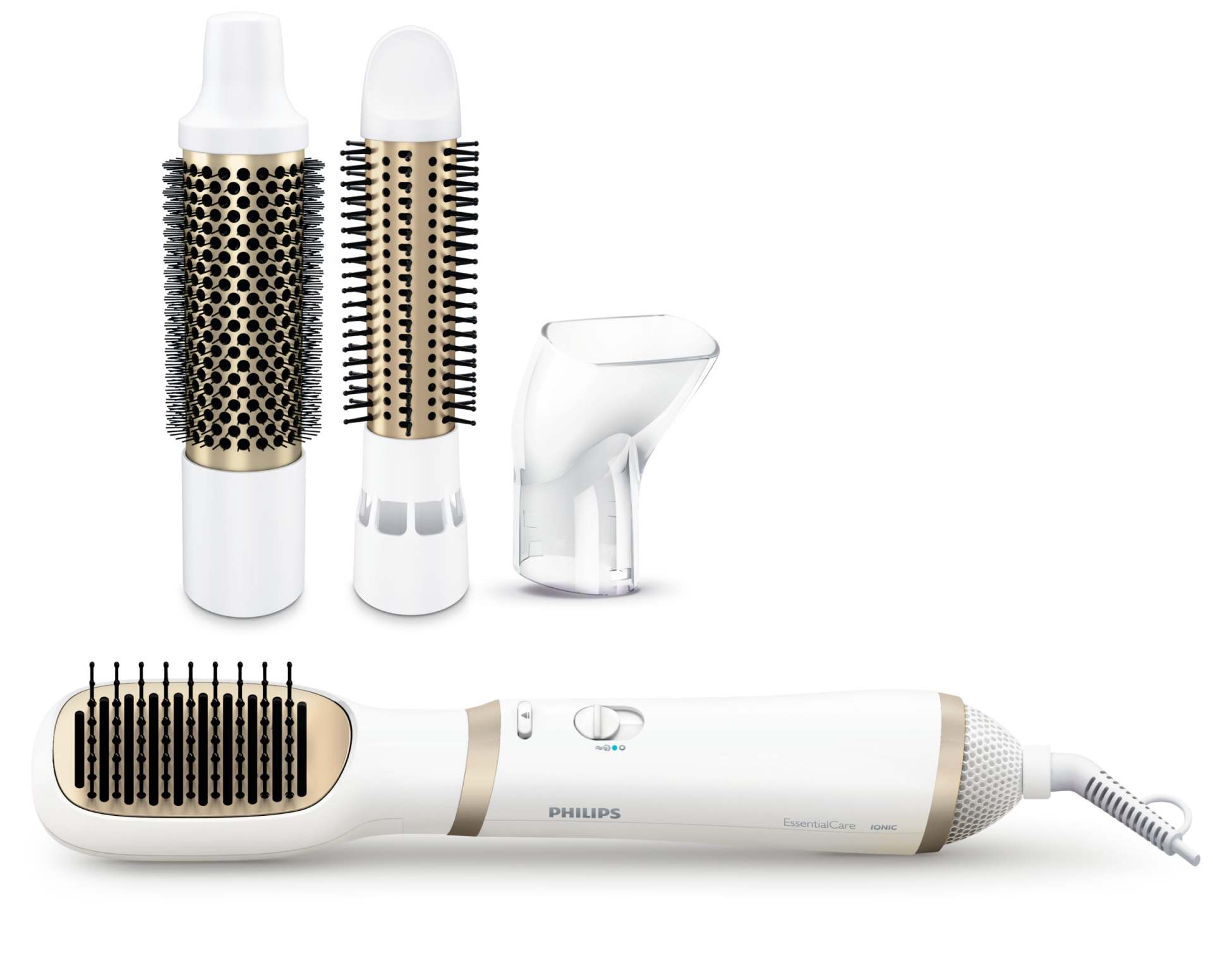 Der Philips EssentialCare Styler HP8663/00 ist ein wahrer Haartraum: Er trocknet und stylt zugleich und ermöglicht voluminöse Looks, als käme man frisch vom Friseur. Ganz ohne Haartrockner und andere Helfer zaubert er natürliche Styles, glatt und glänzend, Wellen oder Locken und bewahrt dabei die Haargesundheit. Seine vier Aufsätze erlauben ein schönes, natürliches Styling und bieten gleichzeitig maximale Pflege. Der breite Paddlebürsten-Aufsatz bringt besonders längere, glatte Haare schonend zum Glänzen. Die Thermobürste (38 Millimeter) erzeugt weich fallende Wellen. Mit einem Klick wird der Styler zum Lockenstab: Die Borsten lassen sich auf Knopfdruck einziehen, so dass er leicht und ohne Ziepen wieder herausgezogen werden kann. Darüber hinaus schenkt er Volumen am Ansatz. Die schmale Stylingdüse garantiert, dass der Luftstrom genau dorthin gelangt, wo er benötigt wird. ThermoProtect bietet die optimale Trockentemperatur (57 Grad) und die Ionisierungsfunktion ermöglicht Trocknen ohne statische Aufladung. Kraftvolle 800 Watt erzeugen einen optimalen Luftstrom. Wer feines oder trockenes Haar hat, wird sich über die besonders schonende Kaltluftstufe freuen.