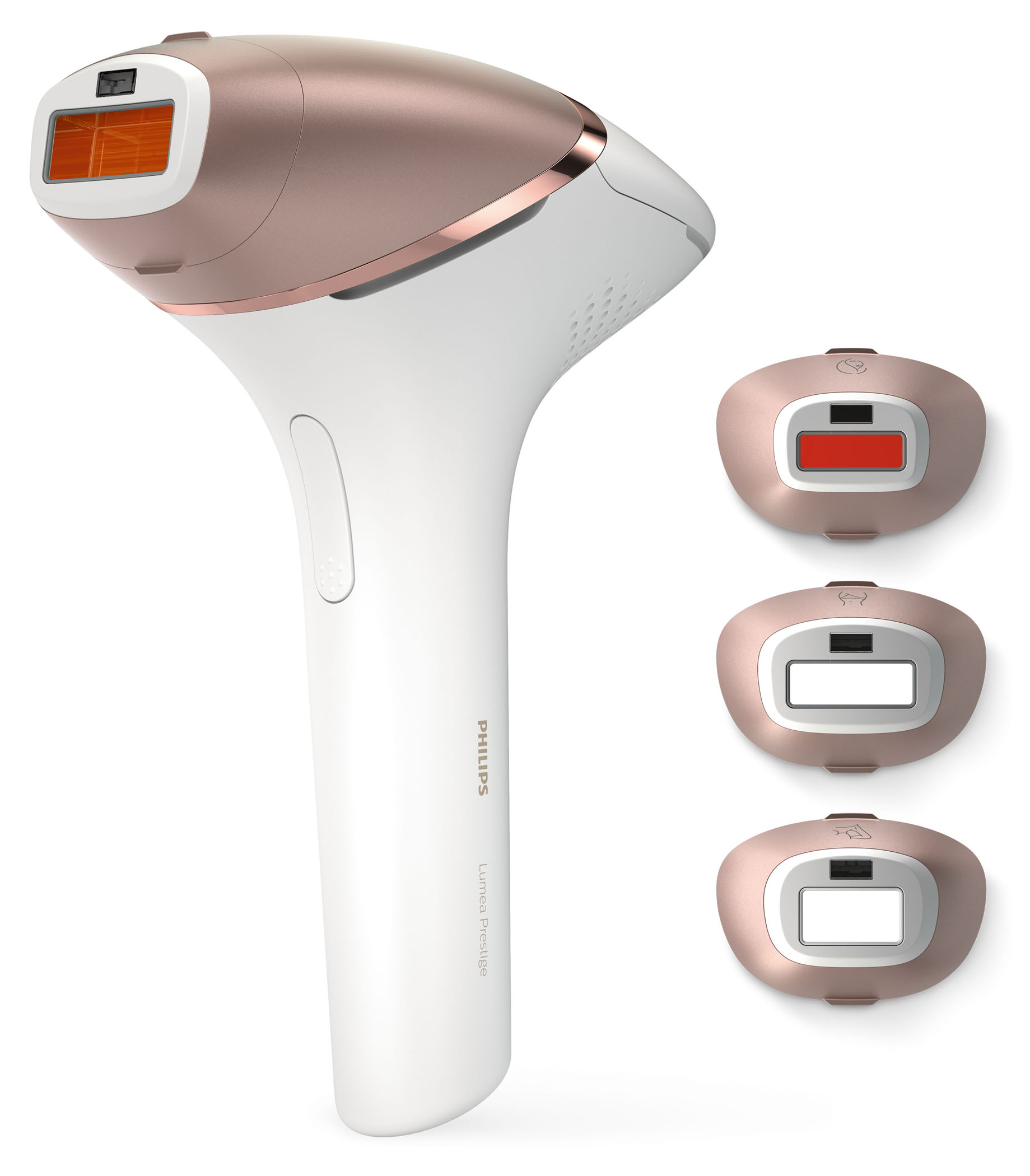 - 4 ergonomisch geformte Aufsätze mit verschiedenen Anwendungsfenster-Größen: Körper – 4,1 cm², Bikinizone – 3 cm², Achsel – 3 cm², Gesicht – 2 cm²