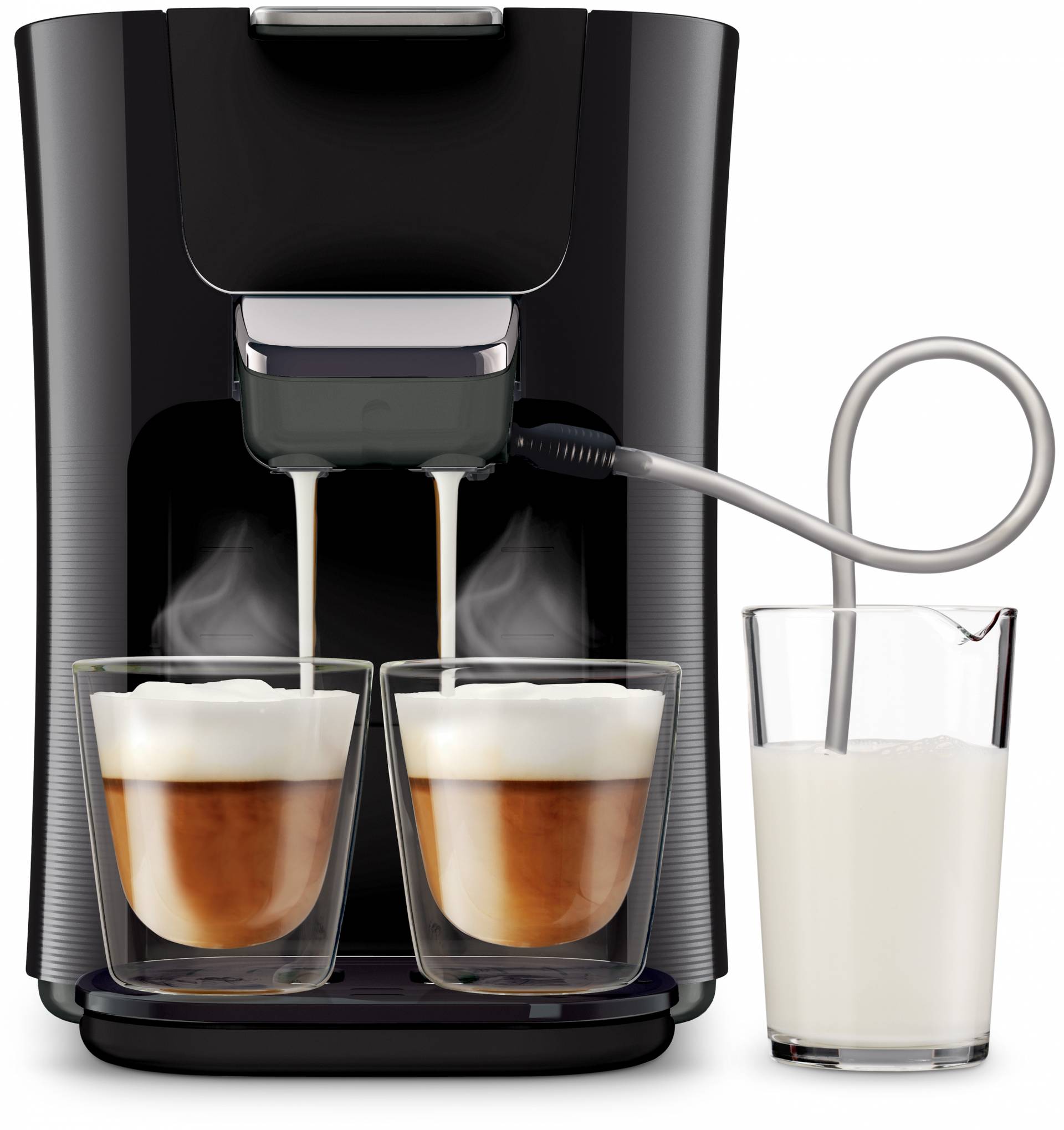 Die Philips Kaffeemaschine Senseo Latte Duo HD7855/50, eine Kaffeepadmaschine in edlem Schwarz bietet Kaffeegenuss für echte Milchliebhaber und verwandelt das eigene Zuhause so zum Lieblingscafé. Der Clou dabei: Mit nur einem Knopfdruck bereitet sie dank der patentierten Duo-Latte-Funktion zwei Heißgetränke mit frischer Milch gleichzeitig zu. Sechs voreingestellte Rezepte stehen zur Auswahl: Cappuccino, Latte Macchiato, Café Latte, fester, reiner Milchschaum und dazu zwei Stärken – ein kleiner, starker oder milder, normaler Kaffee. Die frisch aufgeschäumte Milch bezieht die Maschine über einen Silikonschlauch aus einer beliebigen externen Milchquelle und gibt sie ohne Spritzer als köstlichen Schaum aus. Über das Touch-Panel ganz einfach die gewünschte Variation auswählen und genießen.