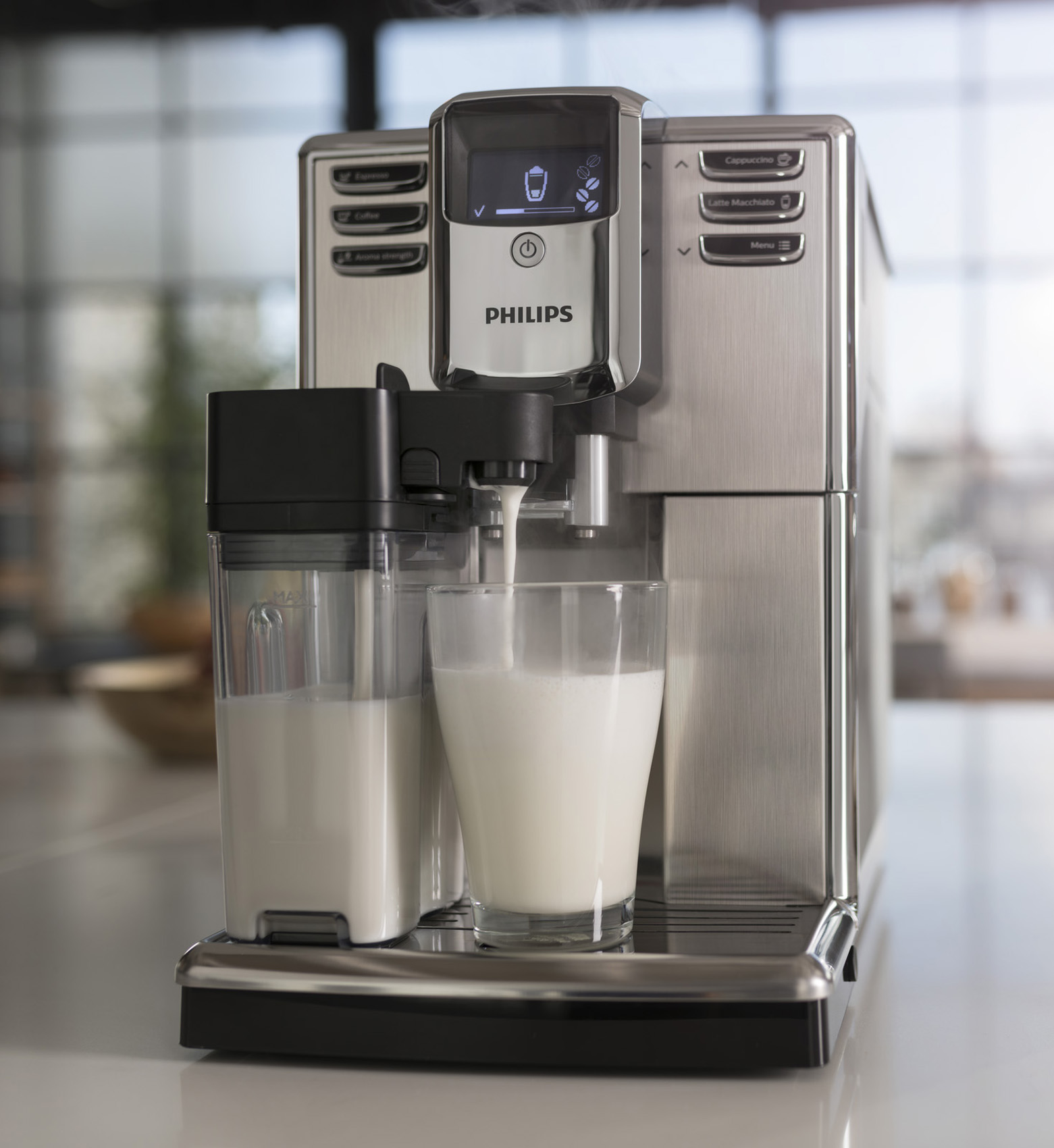 Der Philips Kaffeevollautomat 5000 bereitet vielfältige Kaffeespezialitäten aus frischen Bohnen. Er bietet eine leichte Handhabung sowie einfache und hygienische Pflege. Dabei stehen insgesamt fünf Kaffeevariationen zur Auswahl. Die integrierte Milchkaraffe setzt jeder Milchschaumspezialität eine samtige Krone auf.