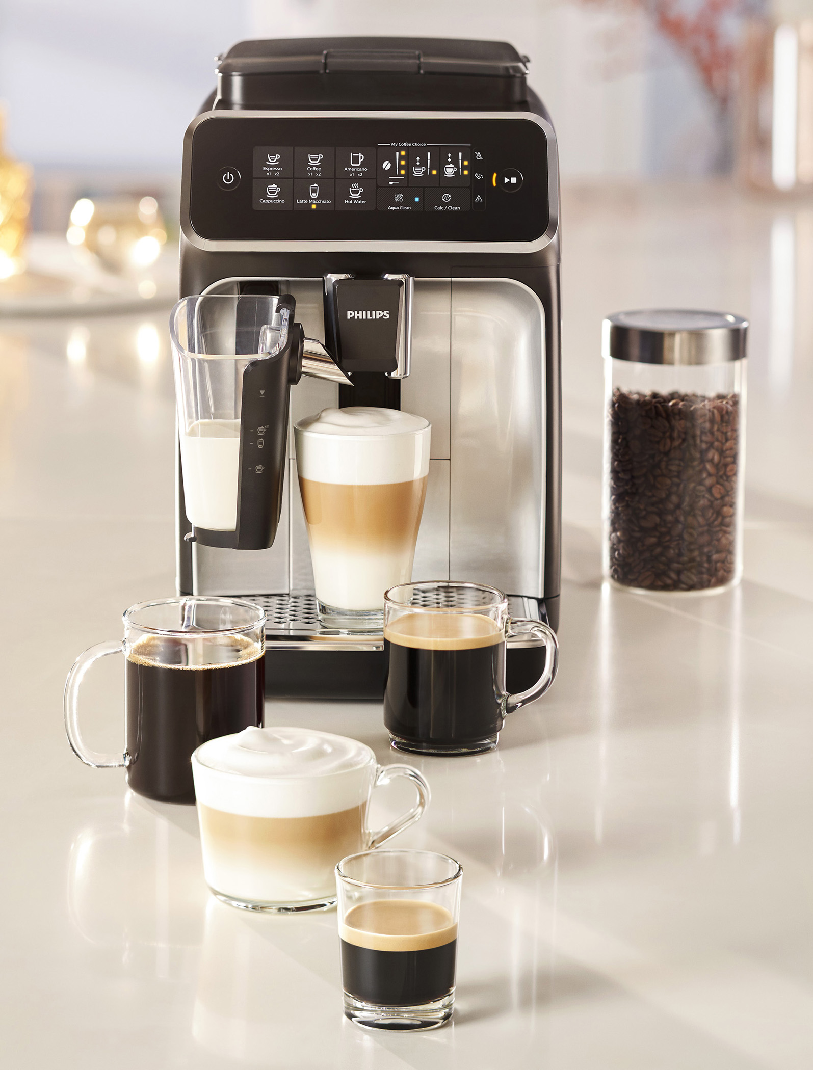 Der Philips Kaffeevollautomat Serie 3200 ist in unterschiedlichen Ausstattungsvarianten erhältlich. Beim Top-Modell kann zwischen fünf Kreationen gewählt werden: Espresso, Kaffee, Americano, Cappuccino oder Latte Macchiato.