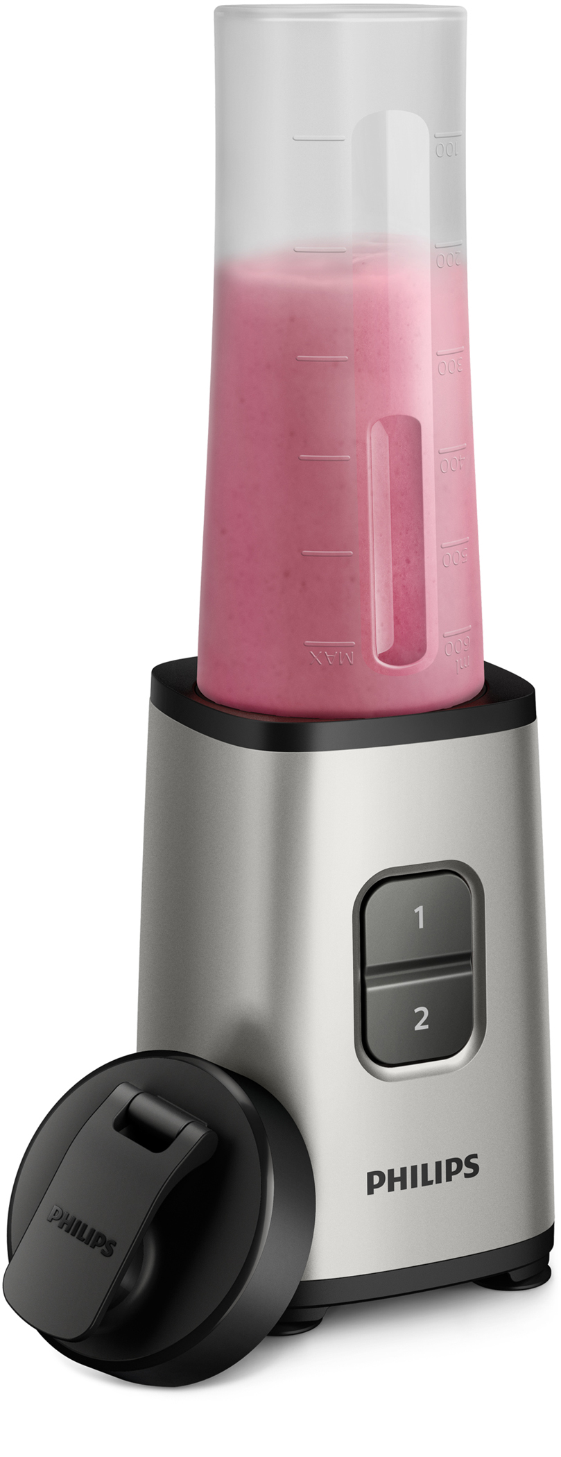 Der Philips Mini-Standmixer bereitet Smoothies und Co. innerhalb von nur 30 Sekunden direkt in eine praktische 0,6 Liter Trinkflasche für unterwegs.