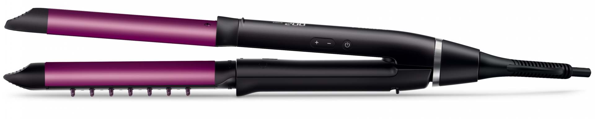 Der Philips Volume Multi-Styler BHH814/00 ist ein echter Profi in Sachen Variation. Sein Geheimnis ist der einzigartige Dreharm. Eine Platte des Stylers kann gedreht und beidseitig verwendet werden. Eine Seite ist halbrund, die andere flach mit einziehbaren Borsten zum Schutz der Kopfhaut. Die Platten des Philips Volume Multi-Styler BHH814/00 sind mit Turmalin-Keramik beschichtet und sorgen für hervorragende Gleitfähigkeit. Die Ionisierungsfunktion reduziert die statische Aufladung und ermöglicht zusätzlichen Glanz. Der Styler bietet digitale Temperatureinstellungen von 150 bis maximal 200 Grad, passend zu jedem Haartyp. Er verfügt über ein zwei Meter langes Kabel und ein LCD-Display. Besonders praktisch ist die hitzebeständige Schutzkappe.