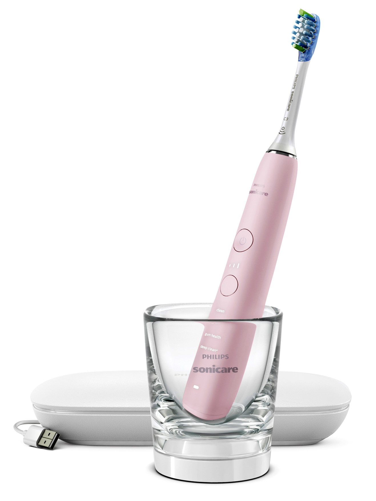 Die Philips Zahnbürste Sonicare DiamondClean 9000er Serie bietet eine Andruckkontrolle, eine intelligente Bürstenkopferkennung, eine Bürstenkopfwechselanzeige sowie verschiedene Putzprogramme und –Intensitäten.