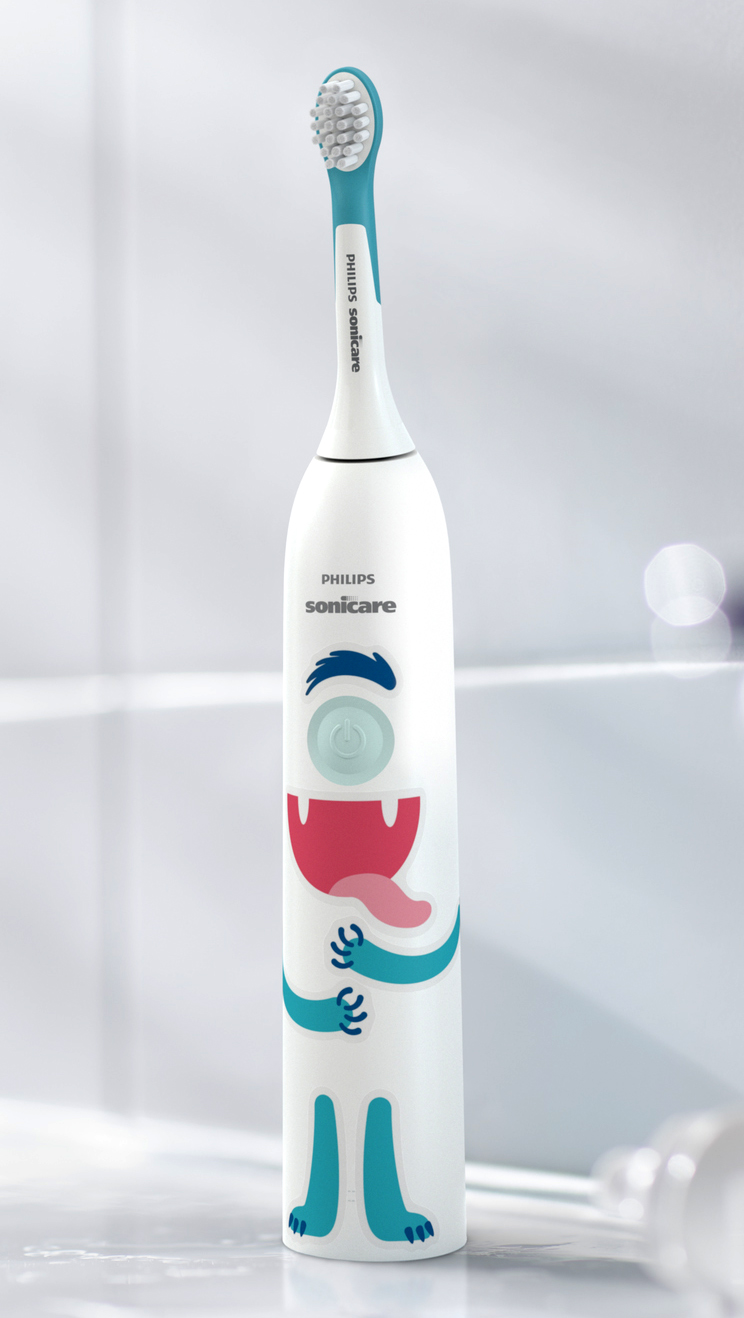 Die Philips Zahnbürste Sonicare For Kids hilft Kindern dabei, eine effektive Zahnputzroutine zu entwickeln. Durch Aufkleber können Kinder ihre Zahnbürste in ein individuell gestaltetes Monster verwandeln. Wann immer sie wollen, können sie eine neue Figur kreieren.