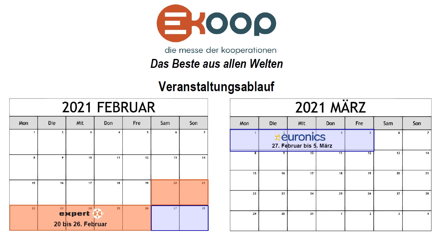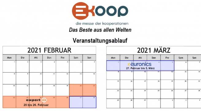 Vom 20. Februar bis zum 5. März 2021 soll unter dem Motto „Das Beste aus allen Welten“ gemeinsam ein innovatives und effizientes Veranstaltungsformat realisiert werden. Weiter heißt es: „Wir sind überzeugt, dass die virtuelle Koop eine wichtige interaktive Informations- und Kommunikationsplattform sein wird, die Mehrwerte für alle Beteiligten bietet. Wir möchten allen Industrie- und Dienstleistungspartnern einen strukturierten Rahmen mit attraktiven Möglichkeiten bieten, um sich mit den Mitgliedern von Euronics und den Gesellschaftern von expert auszutauschen.“
