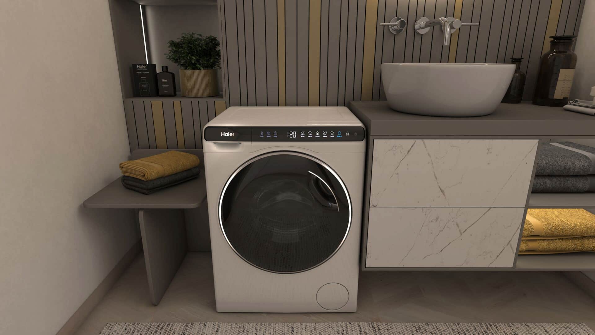 Mit Maßen von 70 cm Höhe und 51 cm Breite präsentiert Haier sein Platzsparwunder unter den Waschmaschinen.